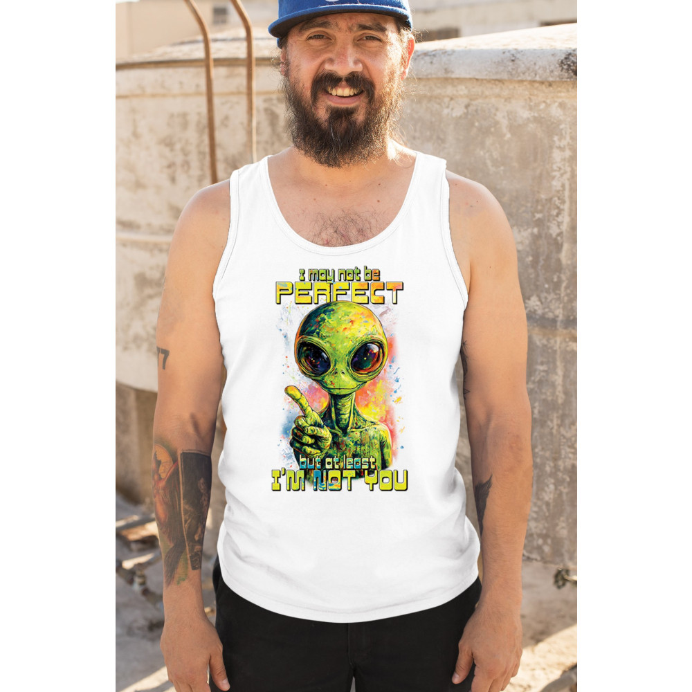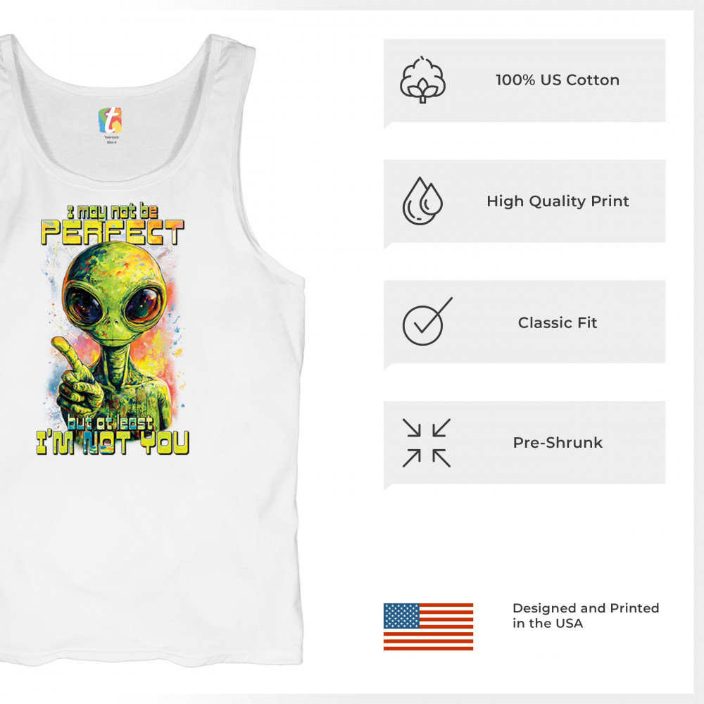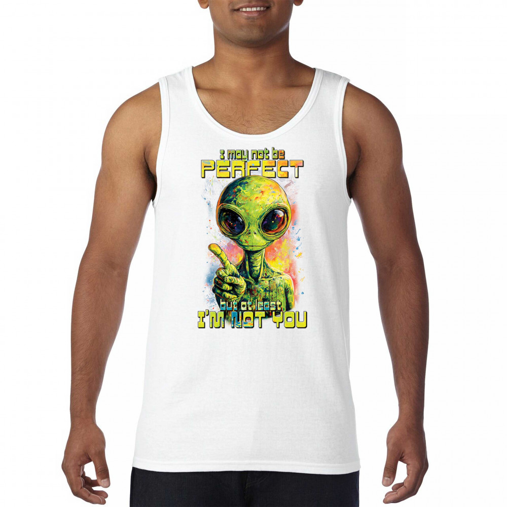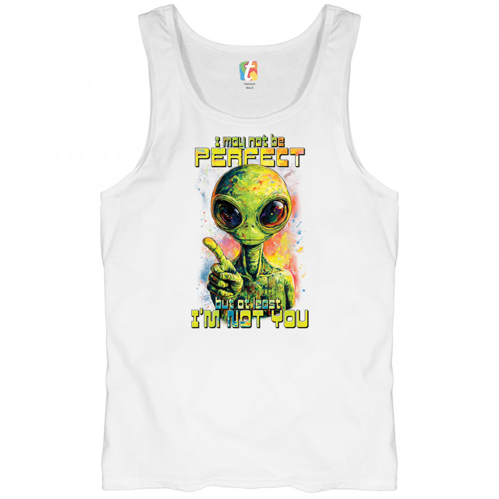 This smug alien design delivers sharp sarcastic humor with vibrant cosmic flair. Featuring a big-eyed extraterrestrial and the quote “I may not be perfect, but at least I’m not you,†it’s perfect for sci-fi fans, alien lovers, jokesters, and oddballs alike. A bold, funny statement for parties, UFO events, and festivals.