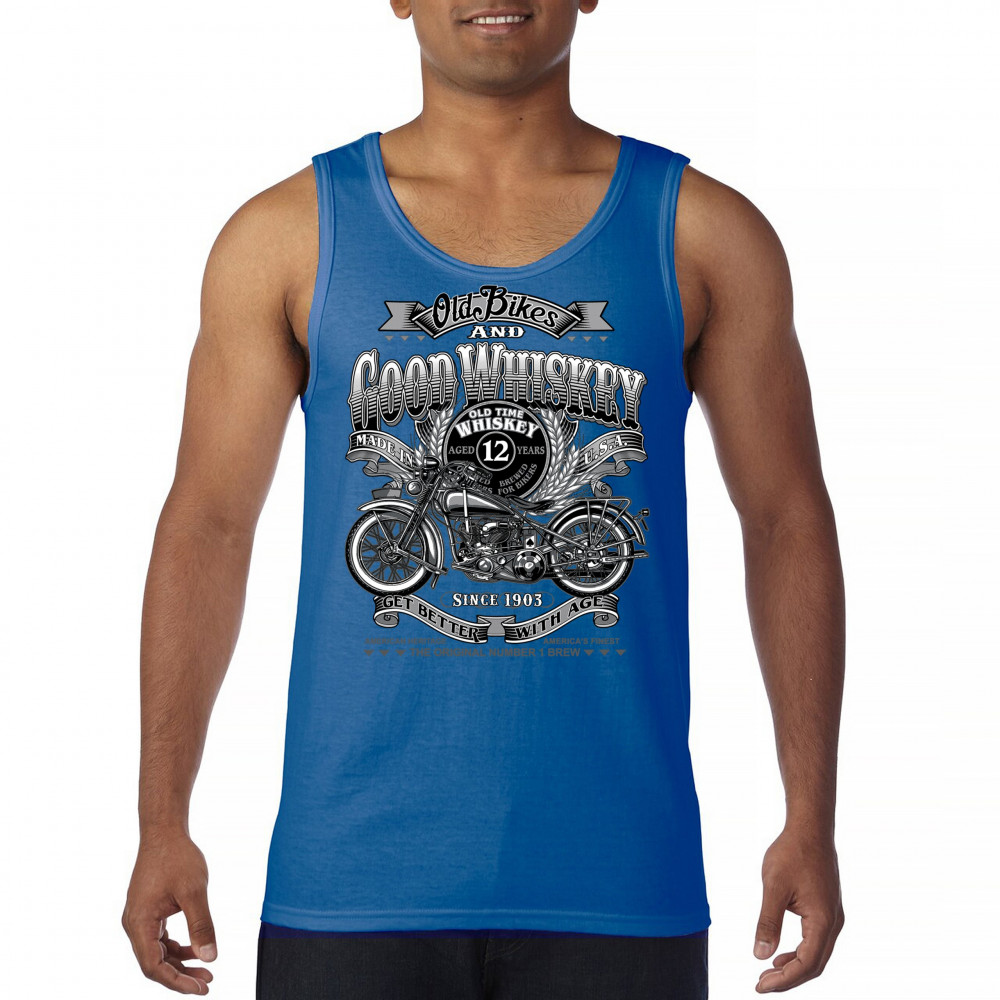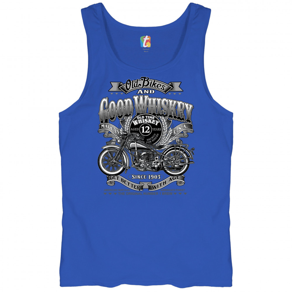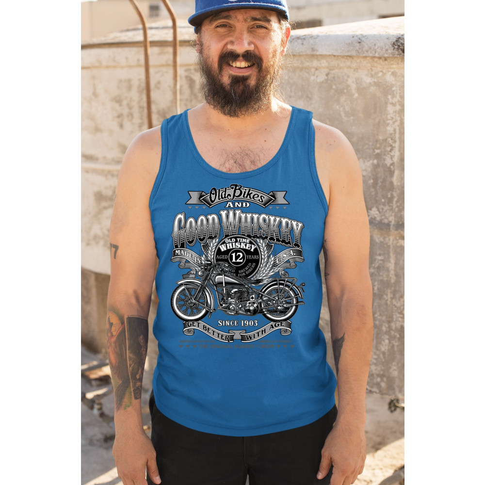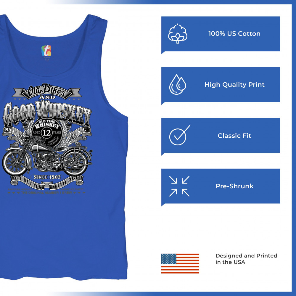 Vintage design with old bike, 12-year whiskey label, and 1903 tribute—perfect for bikers who ride hard and sip slow.