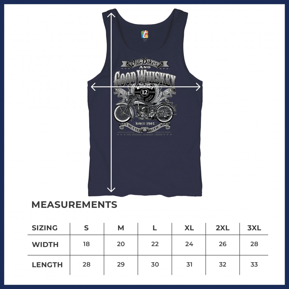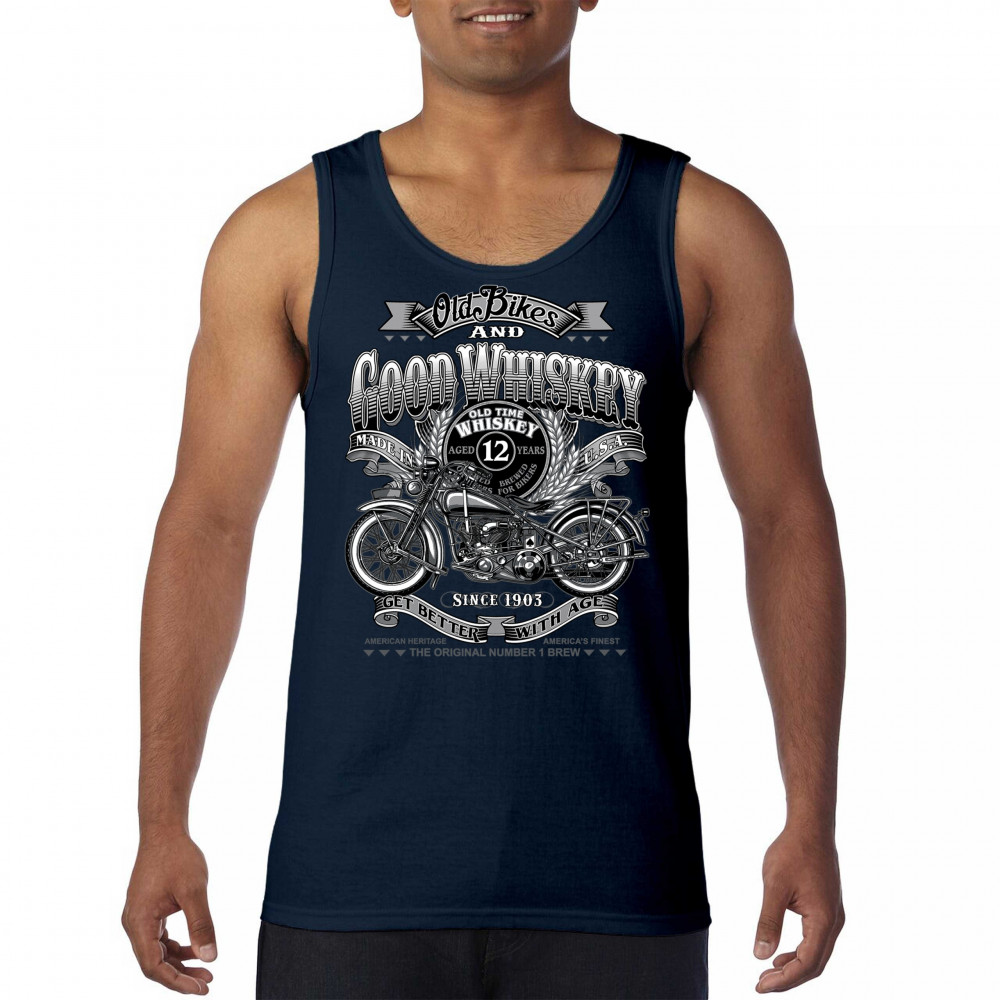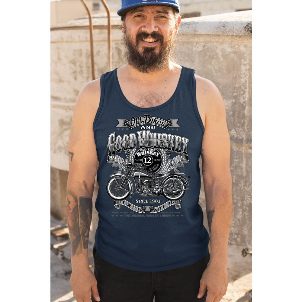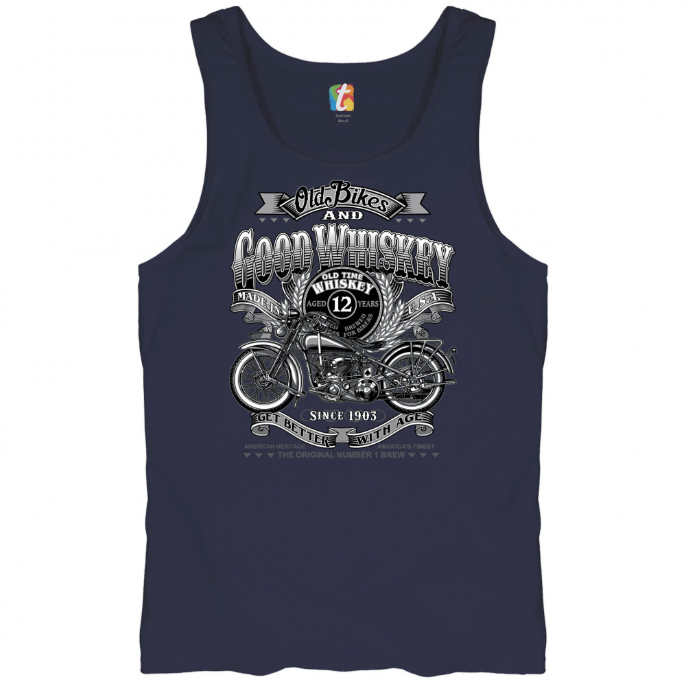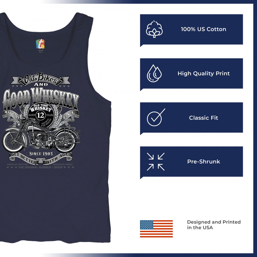 Vintage design with old bike, 12-year whiskey label, and 1903 tribute—perfect for bikers who ride hard and sip slow.