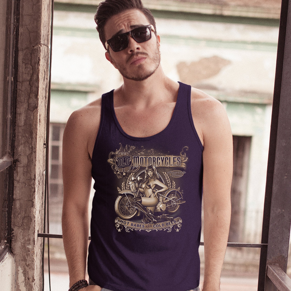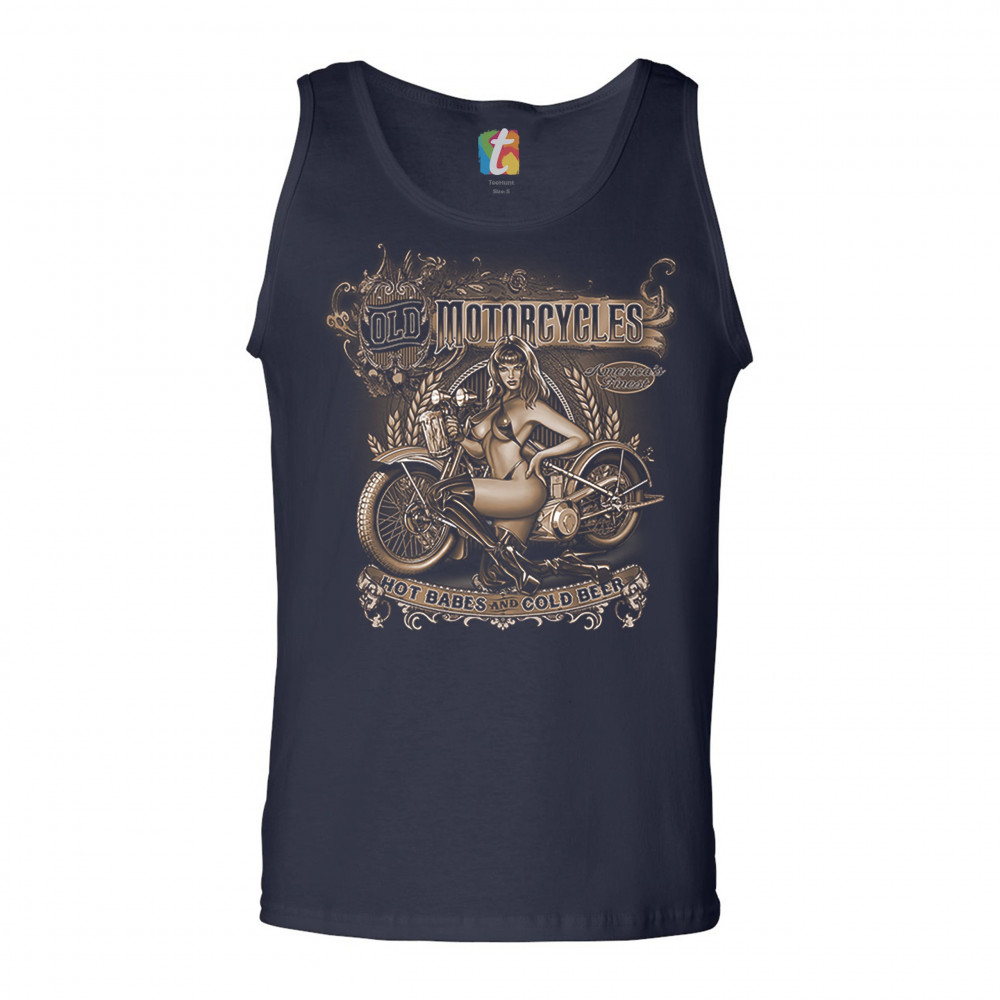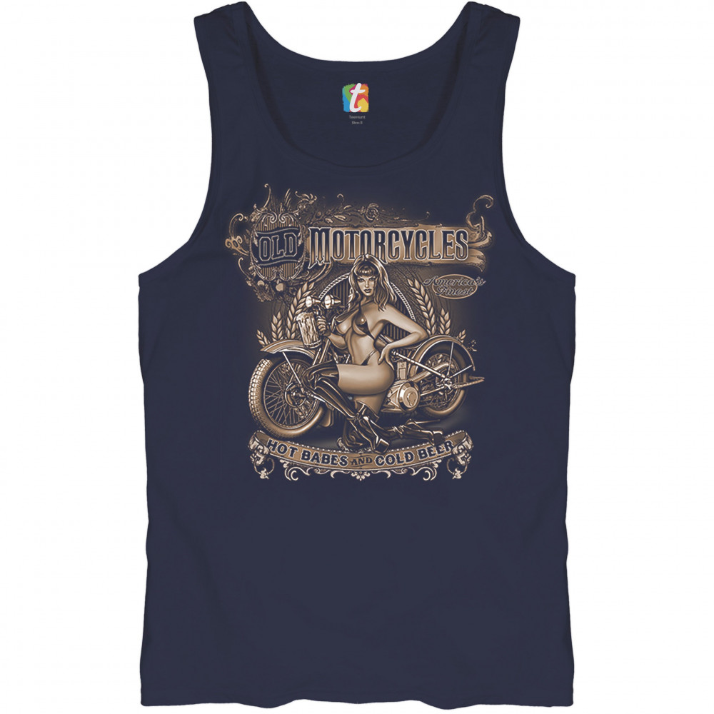 OLD MOTORCYCLES HOT BABES AND COLD BEER tank top biker babe chopper men's top navy blue