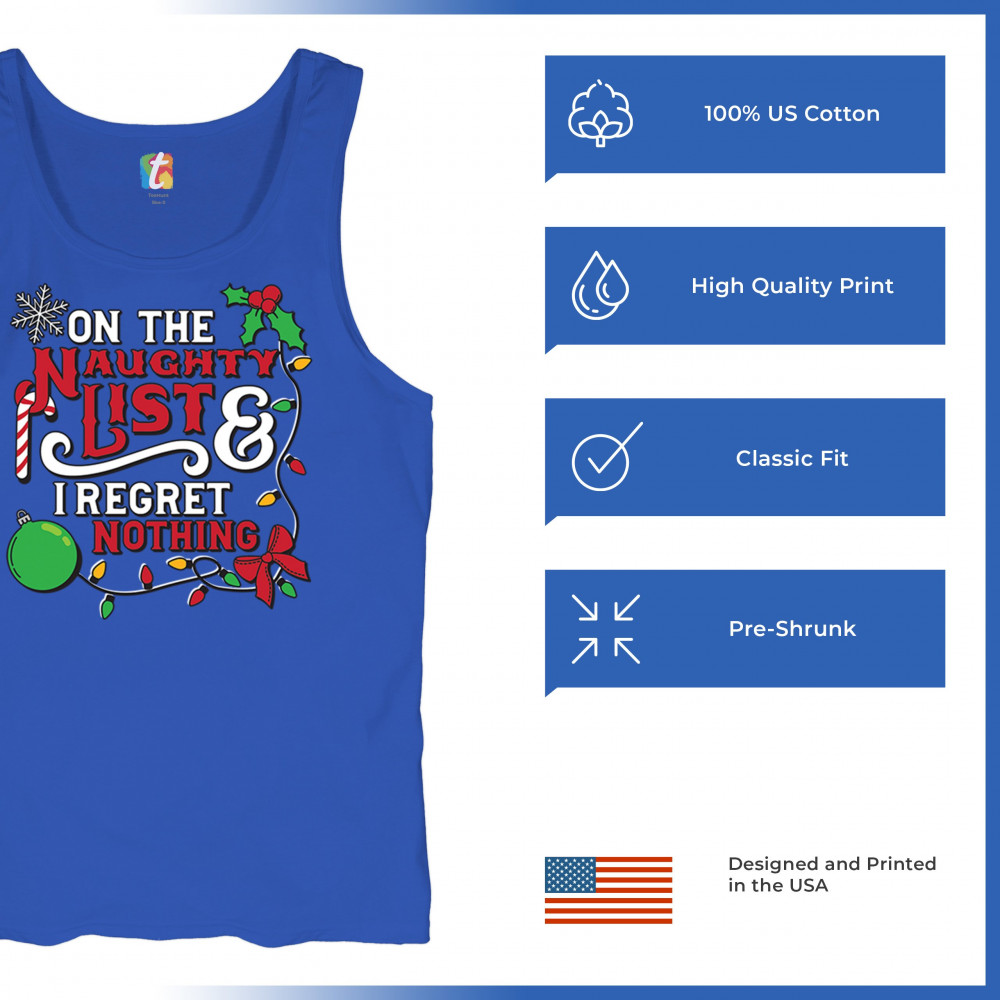 Express your holiday spirit with humor through the "Naughty List & I Regret Nothing" design, a perfect companion for Christmas celebrations, gift exchanges, or festive family gatherings. It adds a touch of playfulness to your winter wardrobe while spreading joy and laughter. Ideal for pairing with an ugly sweater or cozy holiday apparel, it’s the ultimate way to stay jolly and carefree throughout the season.