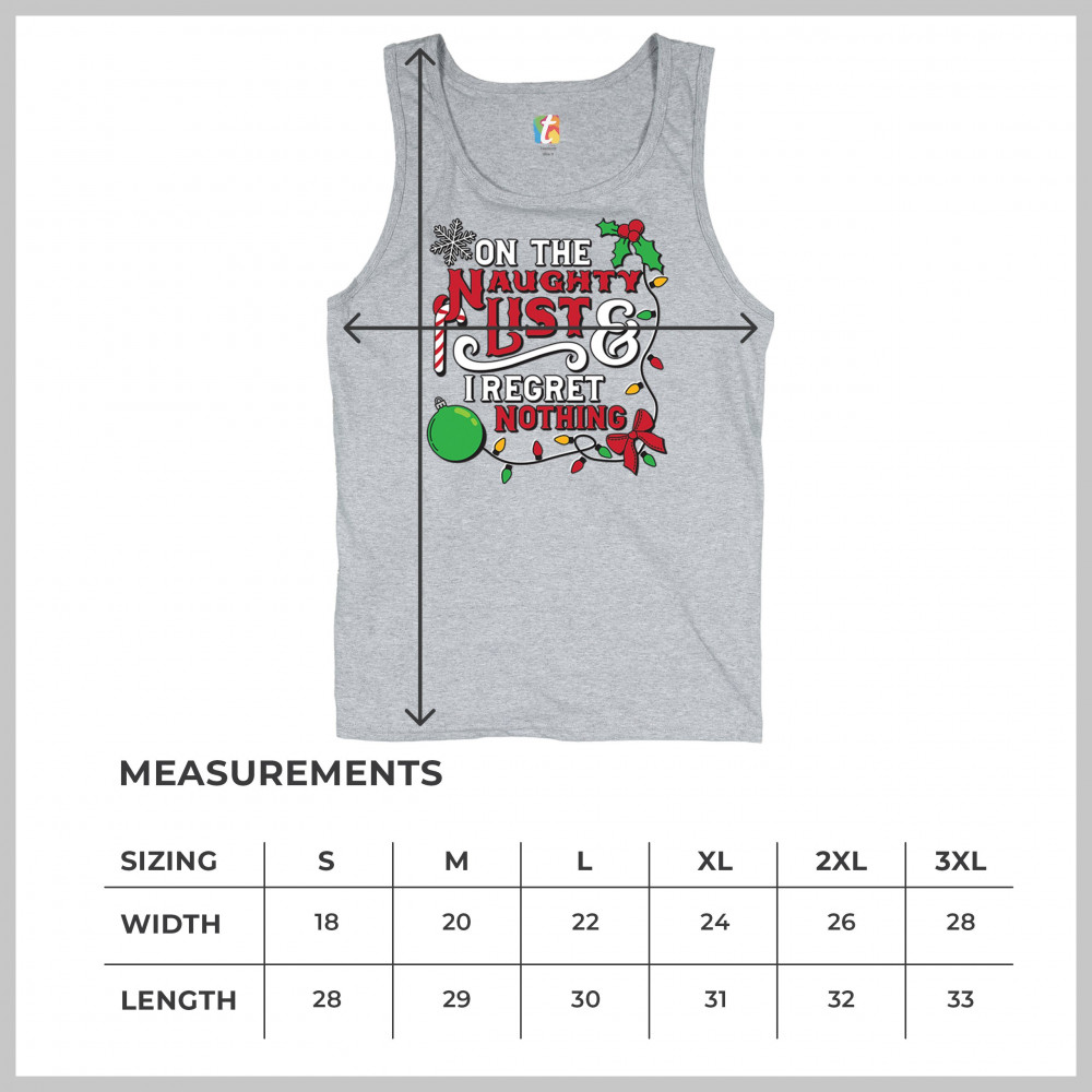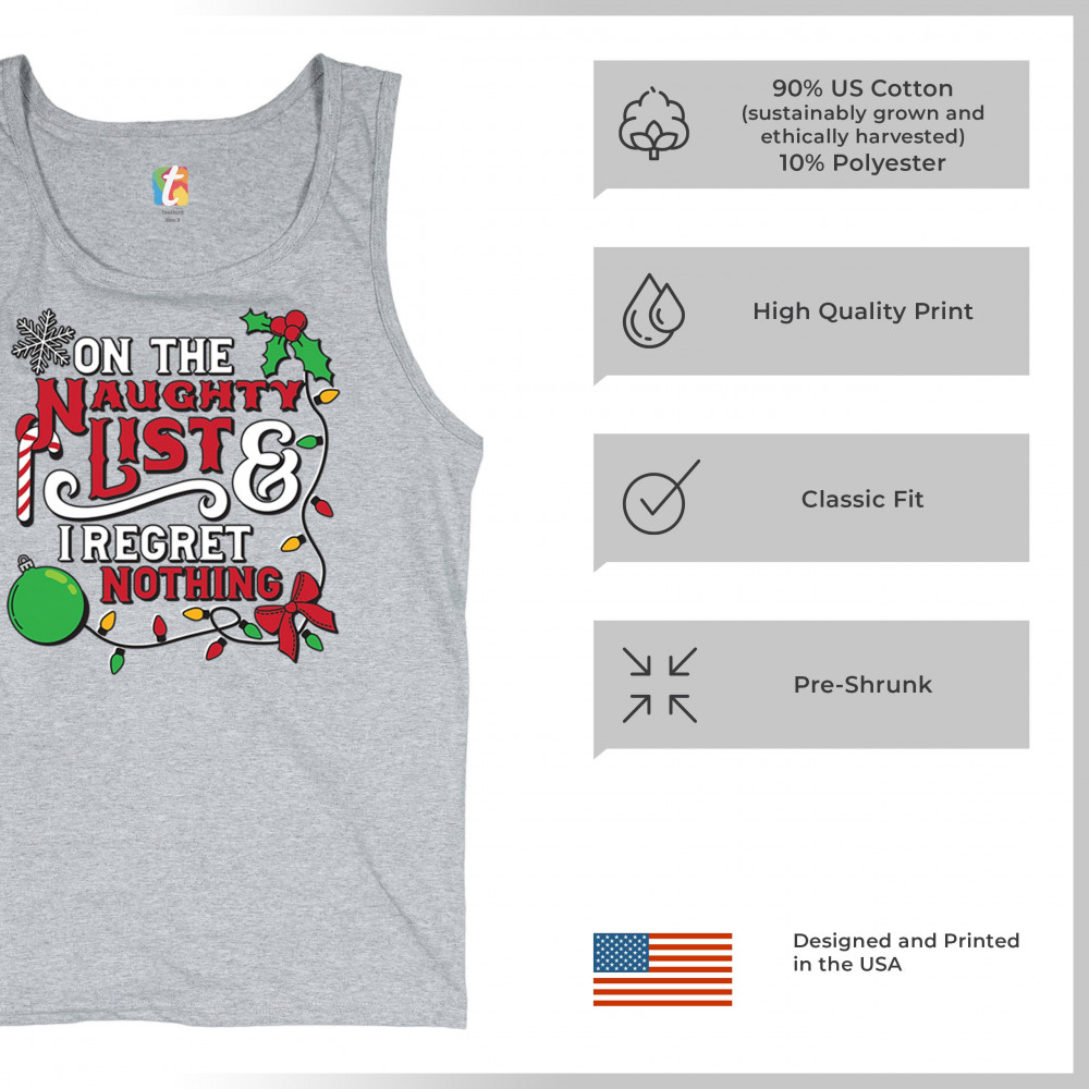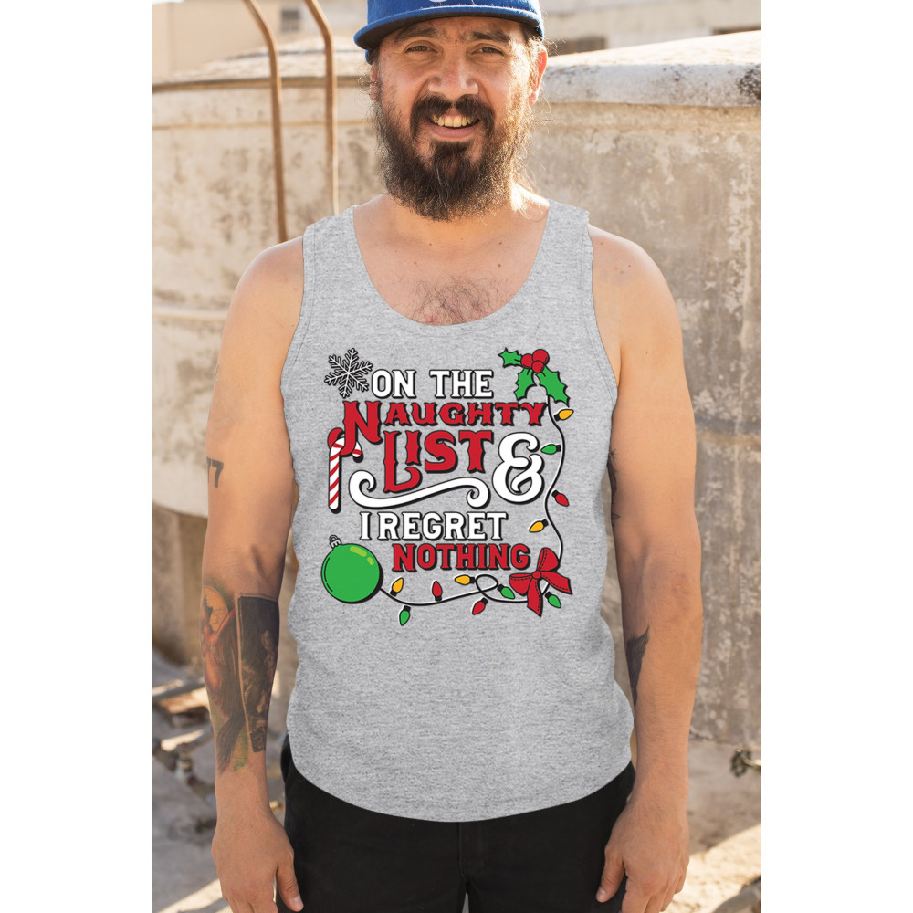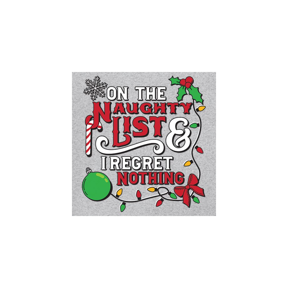 Express your holiday spirit with humor through the "Naughty List & I Regret Nothing" design, a perfect companion for Christmas celebrations, gift exchanges, or festive family gatherings. It adds a touch of playfulness to your winter wardrobe while spreading joy and laughter. Ideal for pairing with an ugly sweater or cozy holiday apparel, it’s the ultimate way to stay jolly and carefree throughout the season.