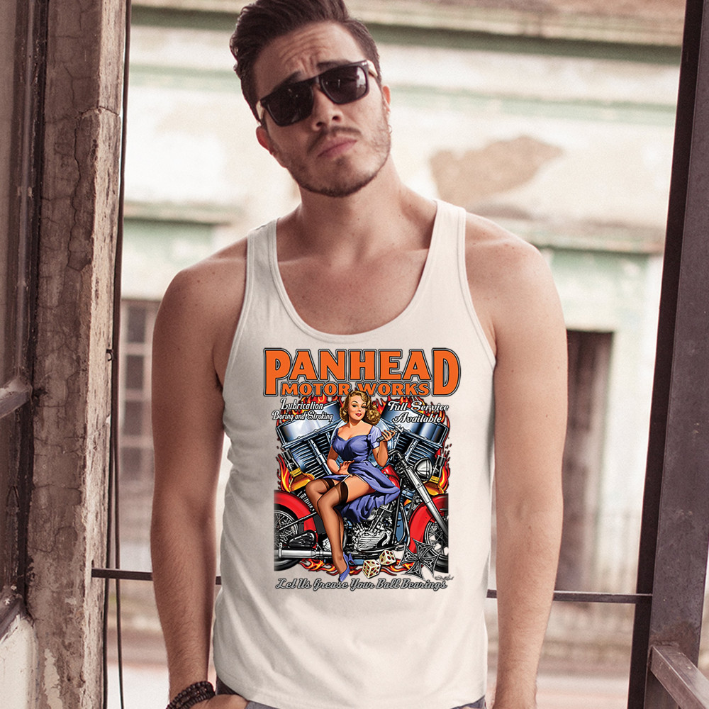 A print featuring a sexy pin-up girl sitting on a chopper motorcycle holding a wrench. In the background there is a V-engine. The print says: "Panhead motor works, Lubrication boring and stroking, Full service available, Let us grease your ball bearings".