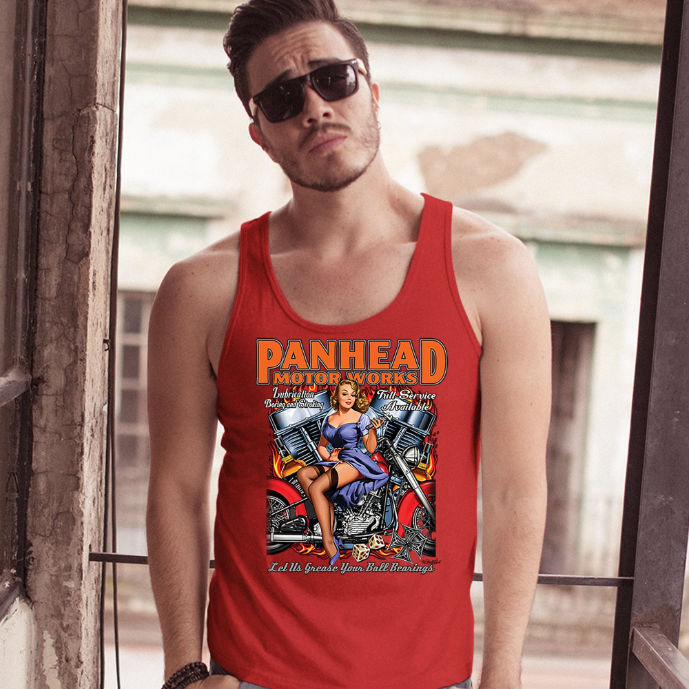 A print featuring a sexy pin-up girl sitting on a chopper motorcycle holding a wrench. In the background there is a V-engine. The print says: "Panhead motor works, Lubrication boring and stroking, Full service available, Let us grease your ball bearings".