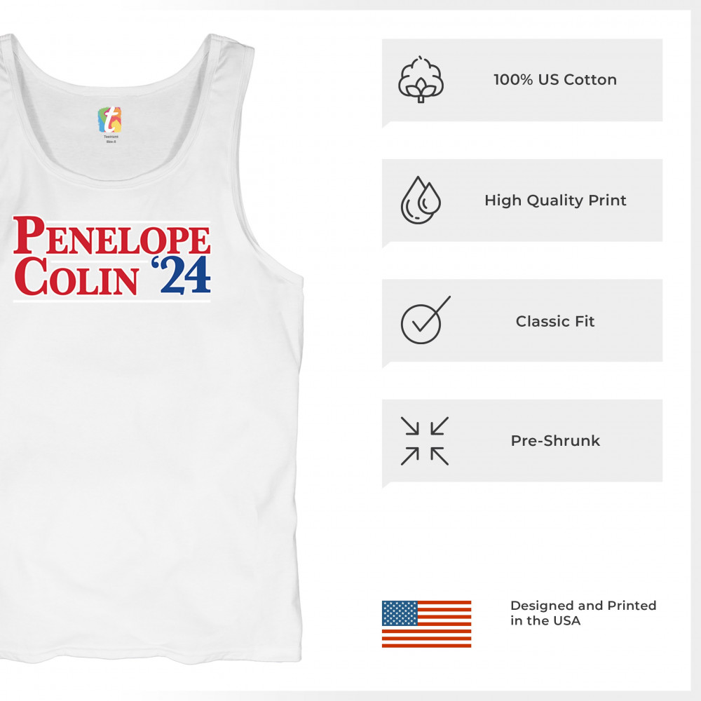 Step into the 2024 election season with a touch of humor and flair with our Penelope and Colin shirt. Designed for fans of political satire and pop culture, this shirt combines quality with a clever twist. Made from soft, high-quality fabric, it ensures comfort and longevity. Perfect for rallies, parties, or just a day out, this shirt will surely make you the center of attention. Embrace the fun side of politics and make a statement with this unique design.