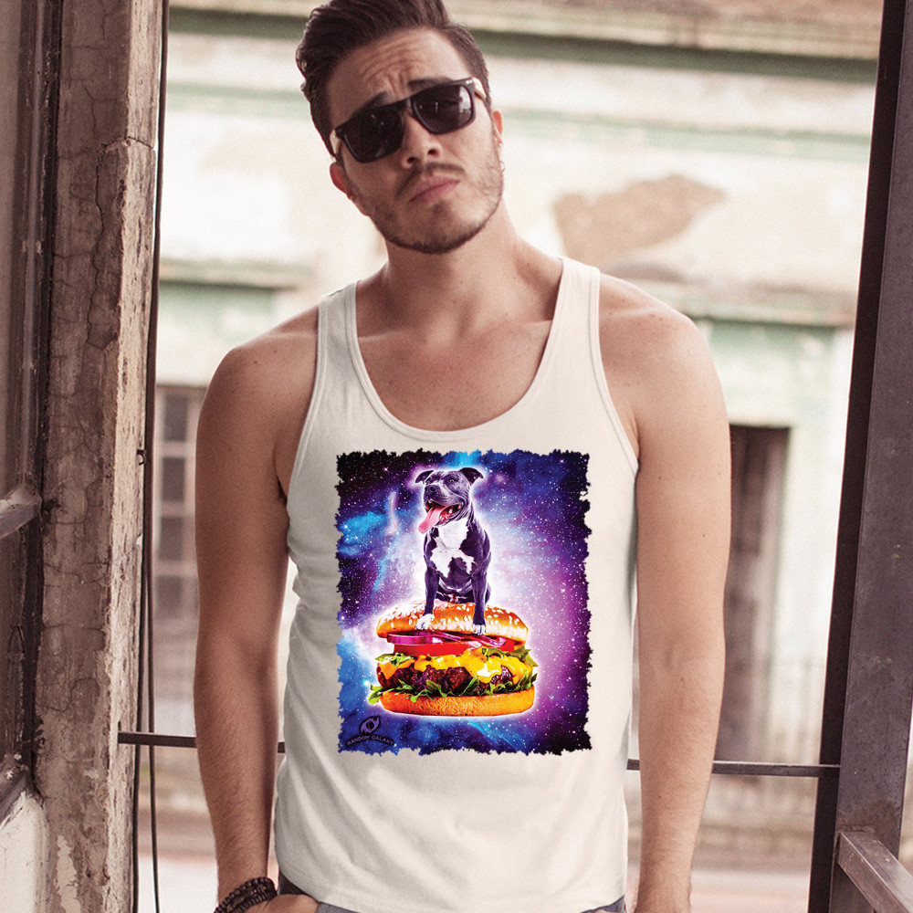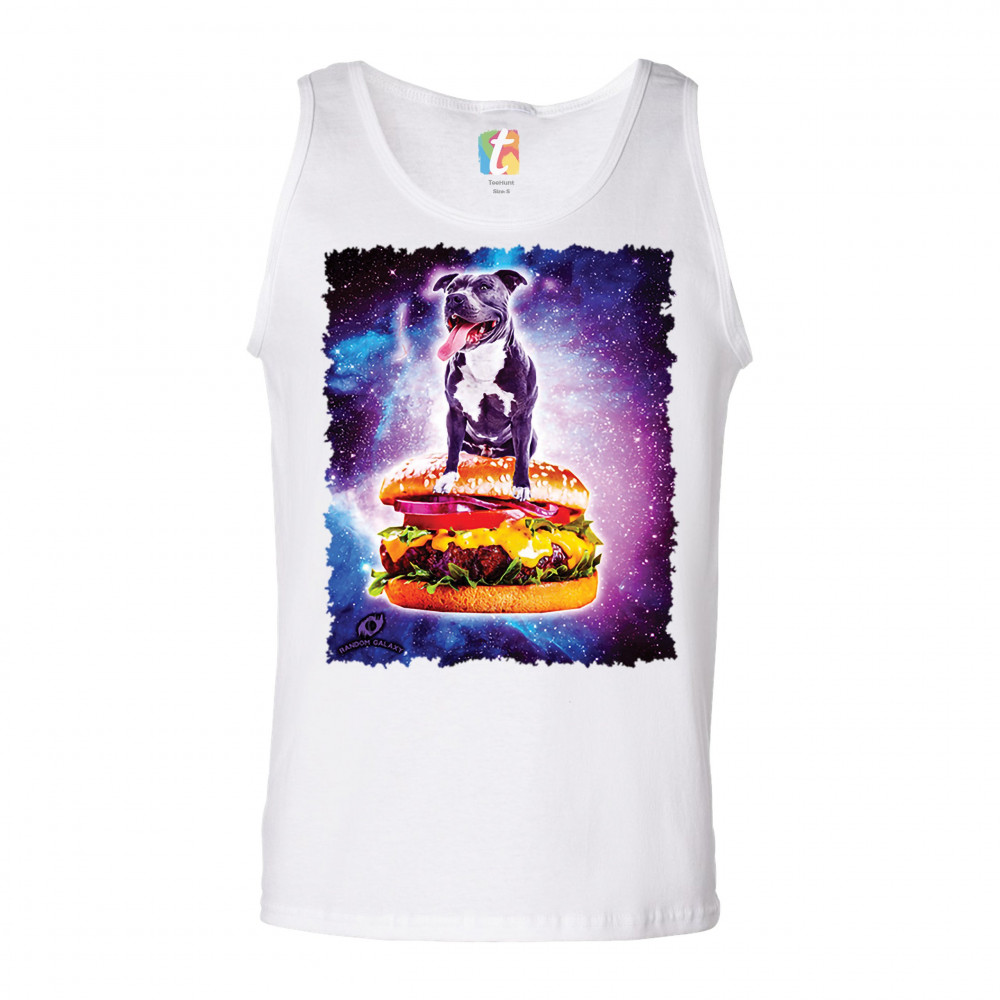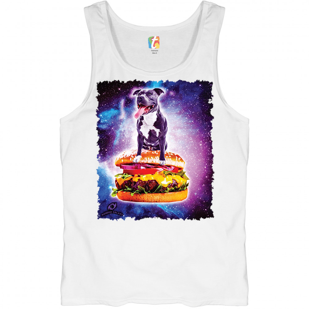 PIT BULL RIDING A BURGER FLYING THROUGH GALAXY tank top funny pet men's top white