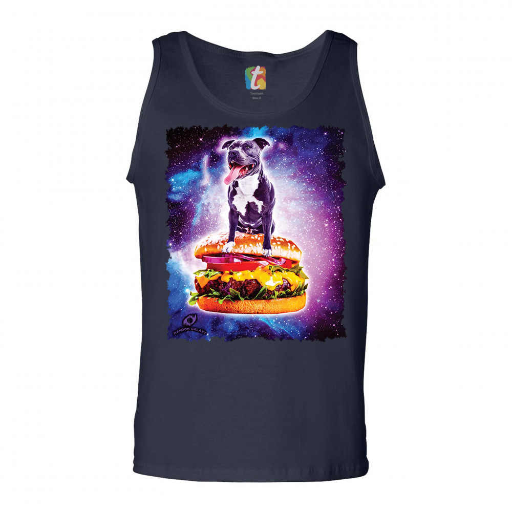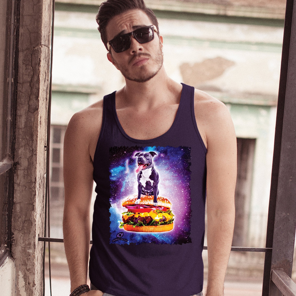 PIT BULL RIDING A BURGER FLYING THROUGH GALAXY tank top funny pet men's top navy blue