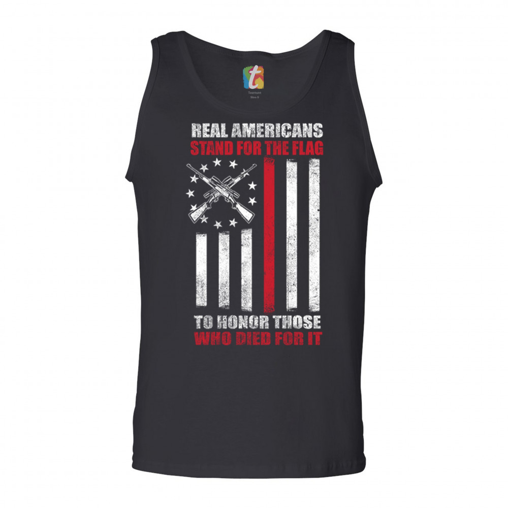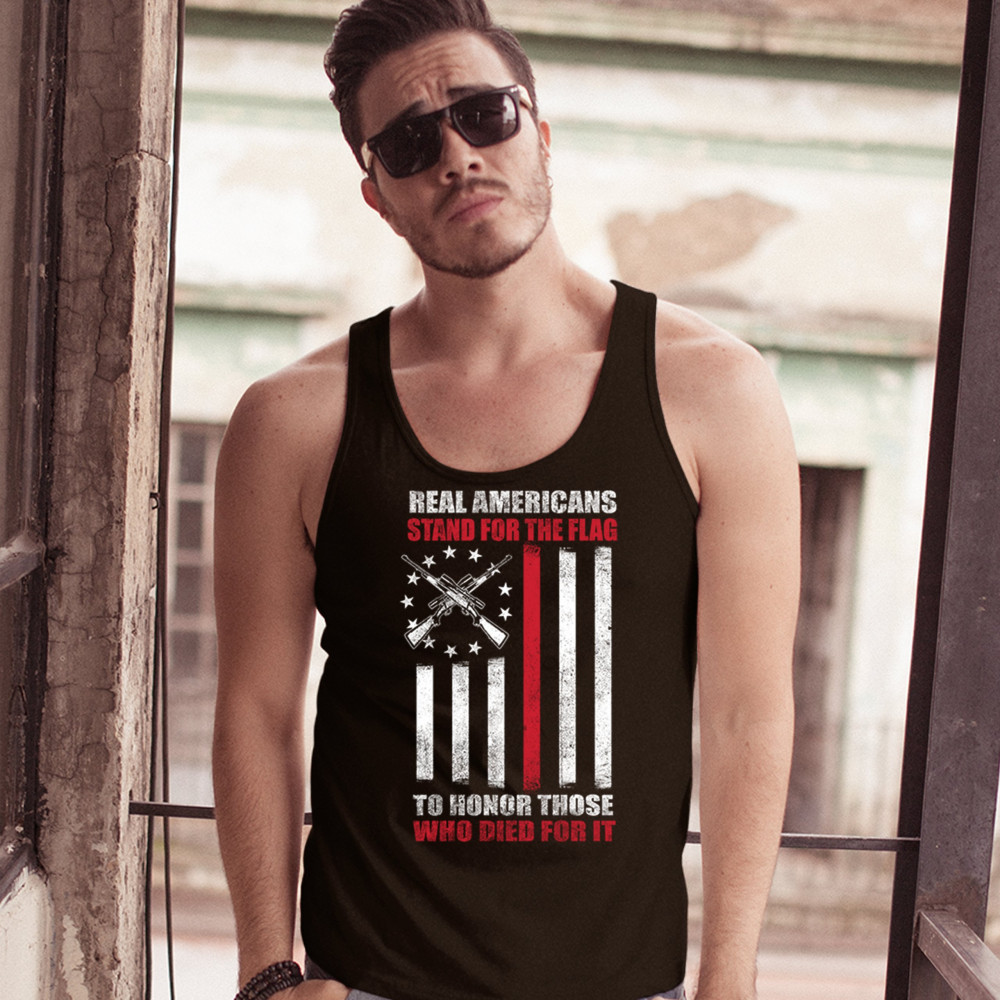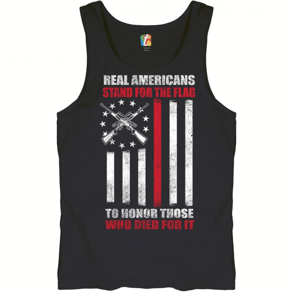 A patriotic print saying "Real Americans Stand for the Flag To Honor Those Who Died for It" and featuring a Betsy Ross American Flag with two crossed rifles inside the circle of stars and a thin red line insted of one of the stripes. Great choice to wear