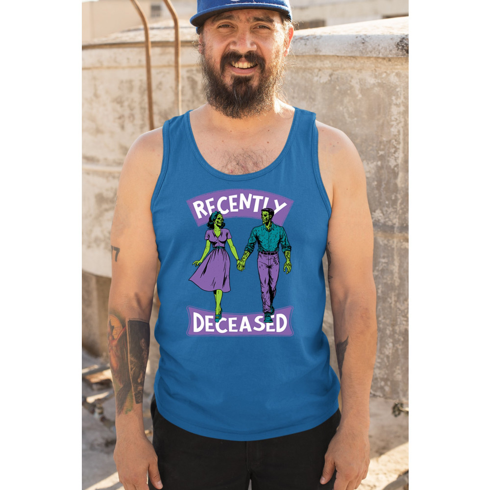 Recently Deceased zombie couple shirt with undead lovers design, spooky season humor, Halloween zombie outfit, and haunted house vibes.