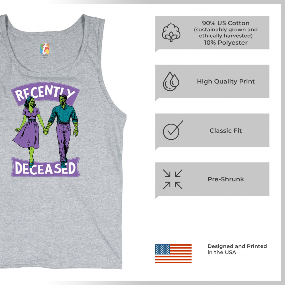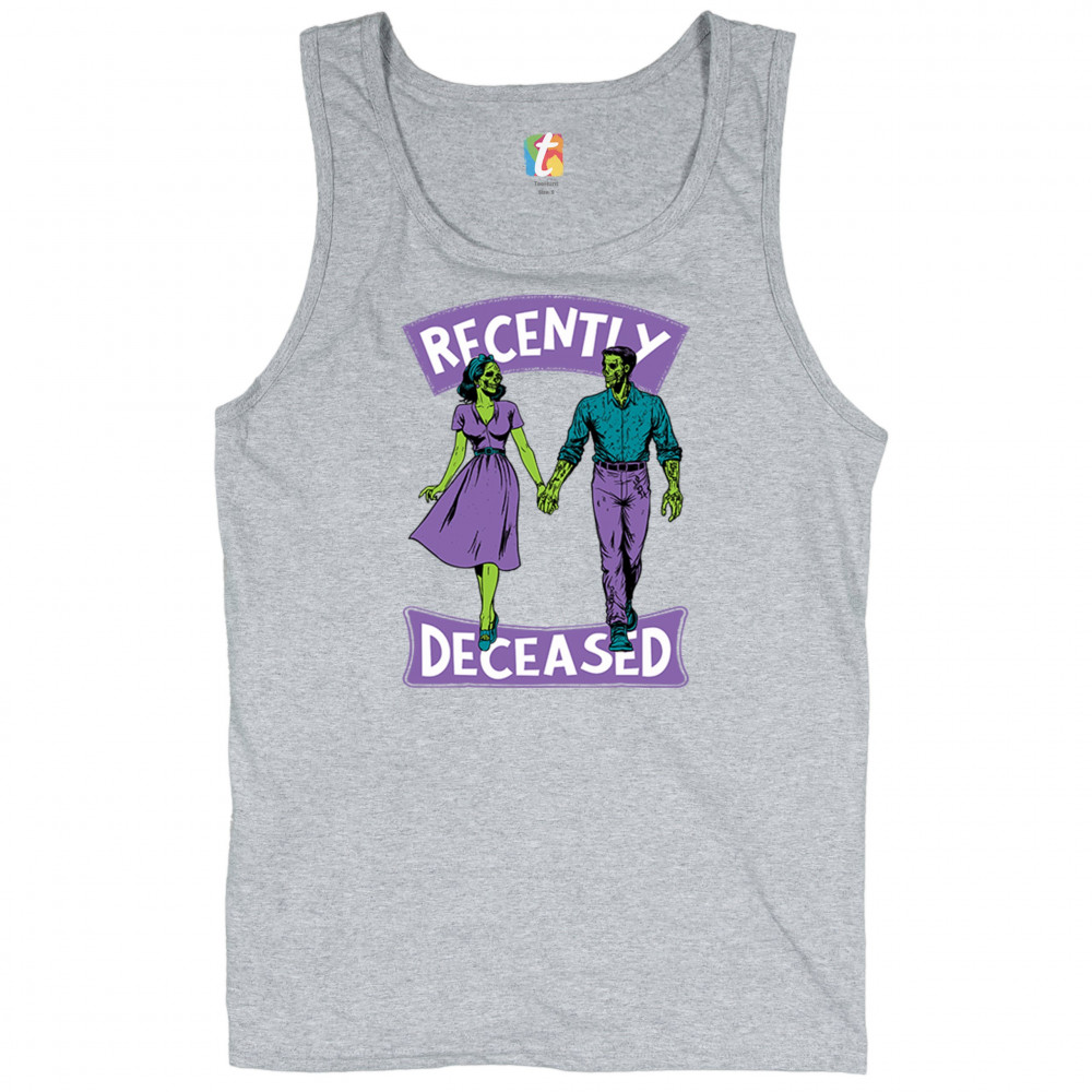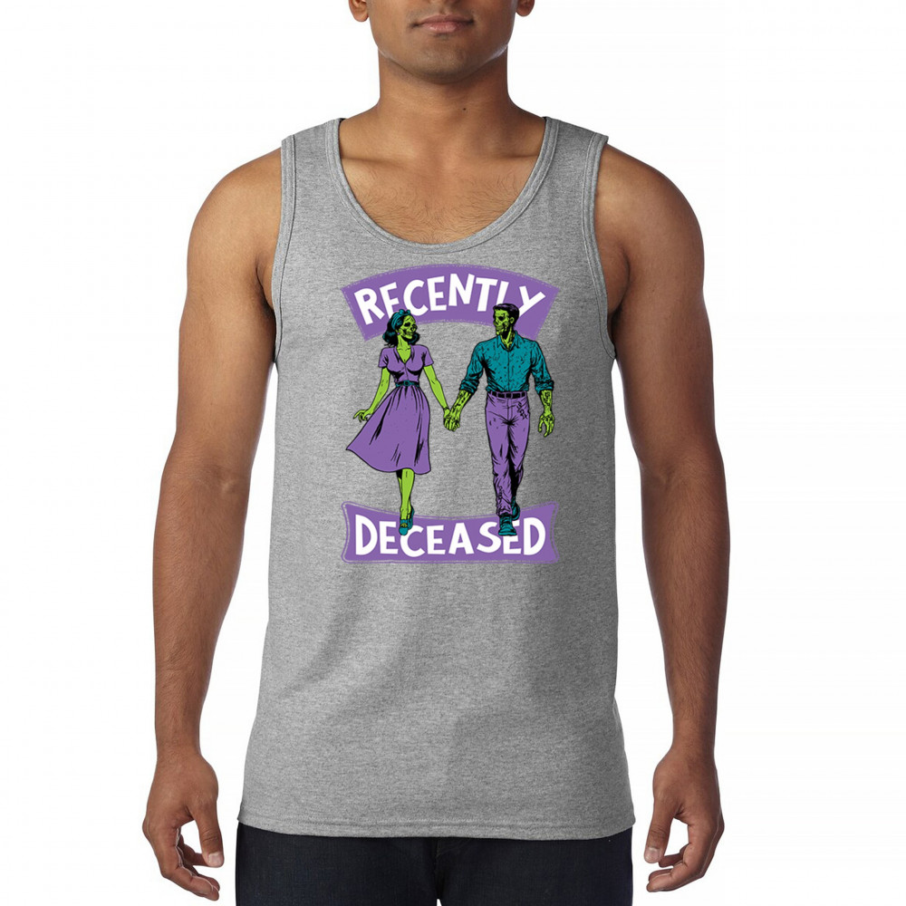 Recently Deceased zombie couple shirt with undead lovers design, spooky season humor, Halloween zombie outfit, and haunted house vibes.