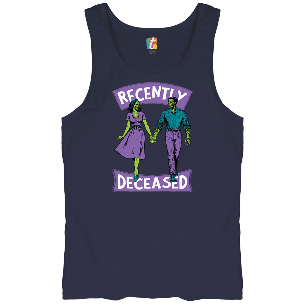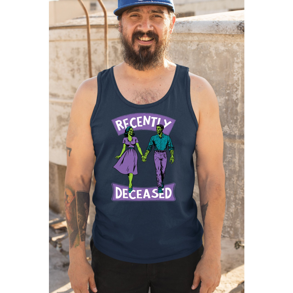 Recently Deceased zombie couple shirt with undead lovers design, spooky season humor, Halloween zombie outfit, and haunted house vibes.