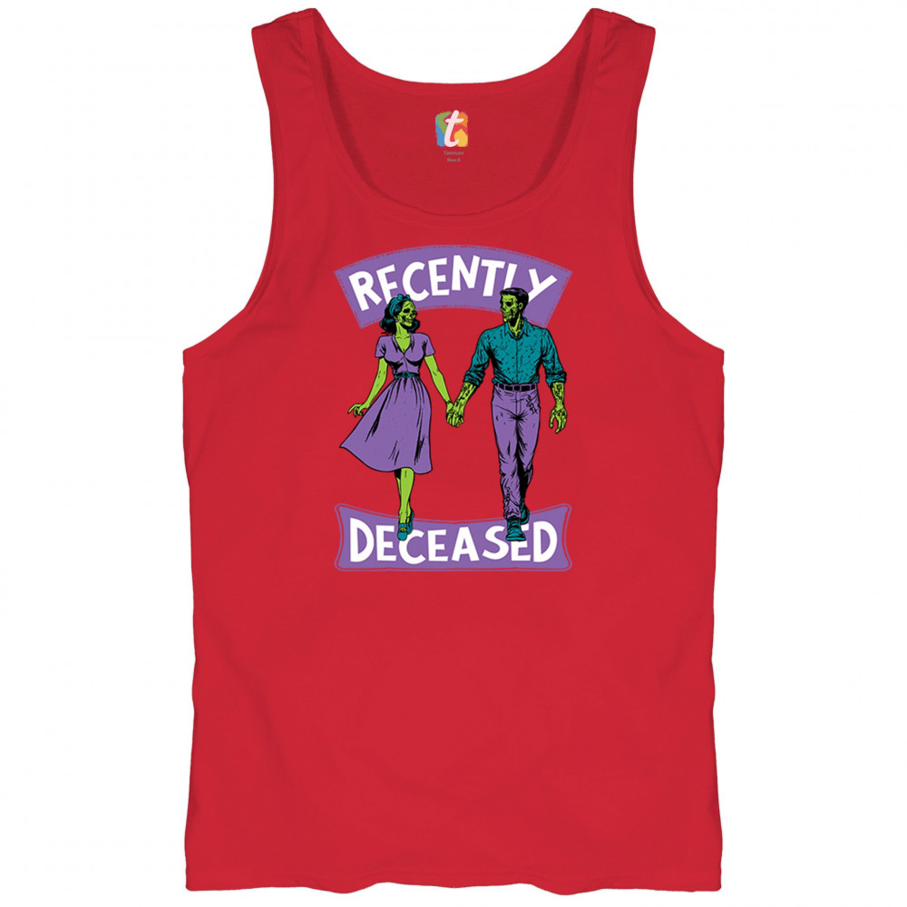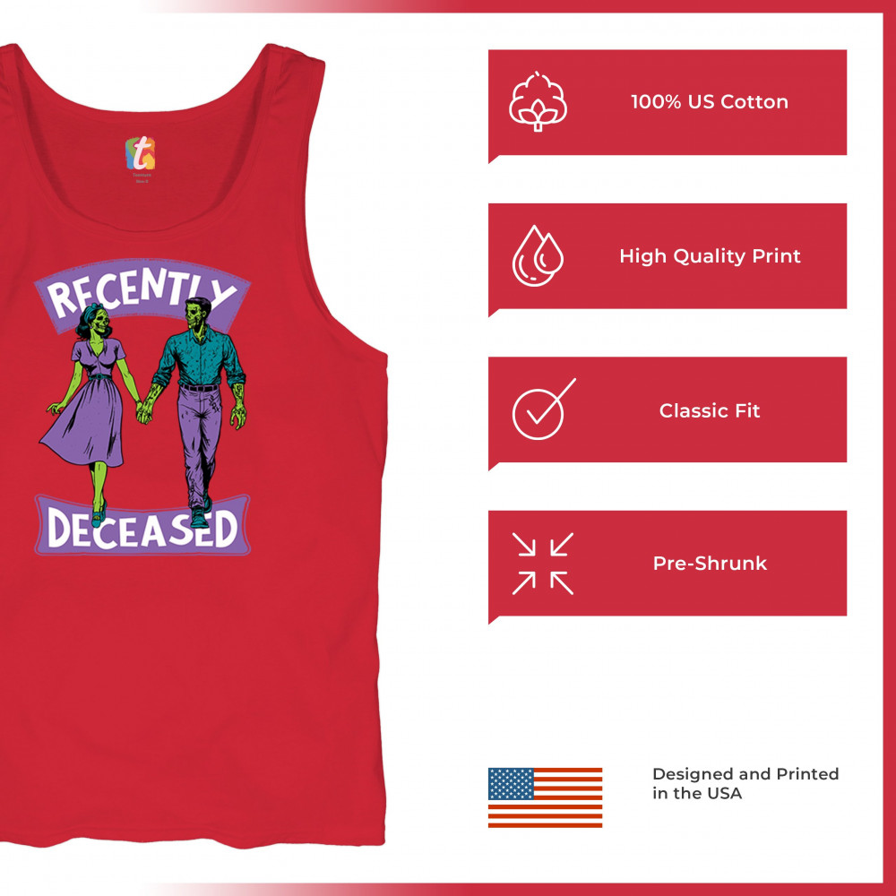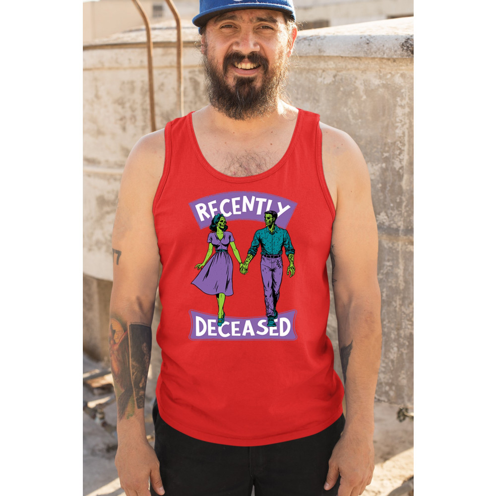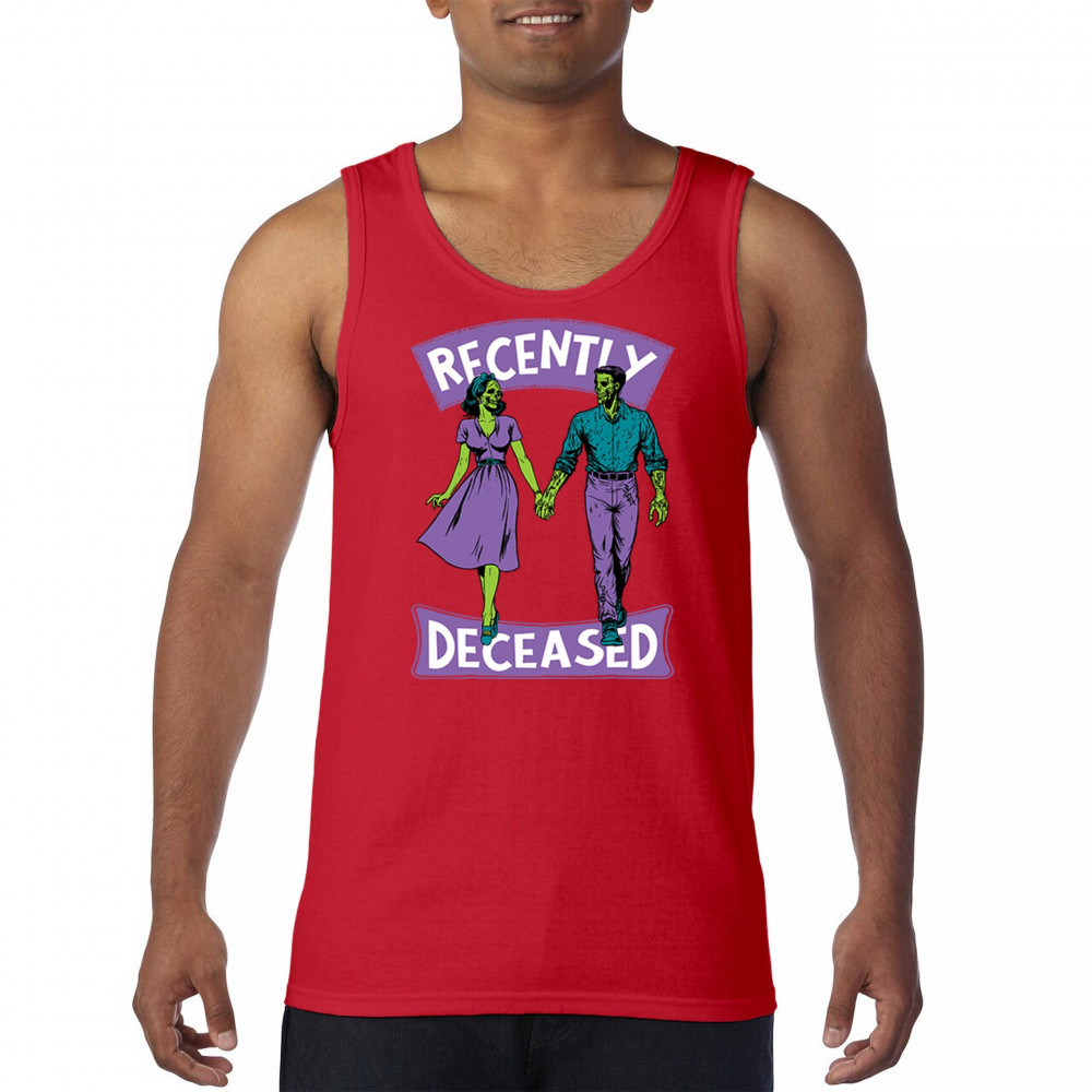 Recently Deceased zombie couple shirt with undead lovers design, spooky season humor, Halloween zombie outfit, and haunted house vibes.
