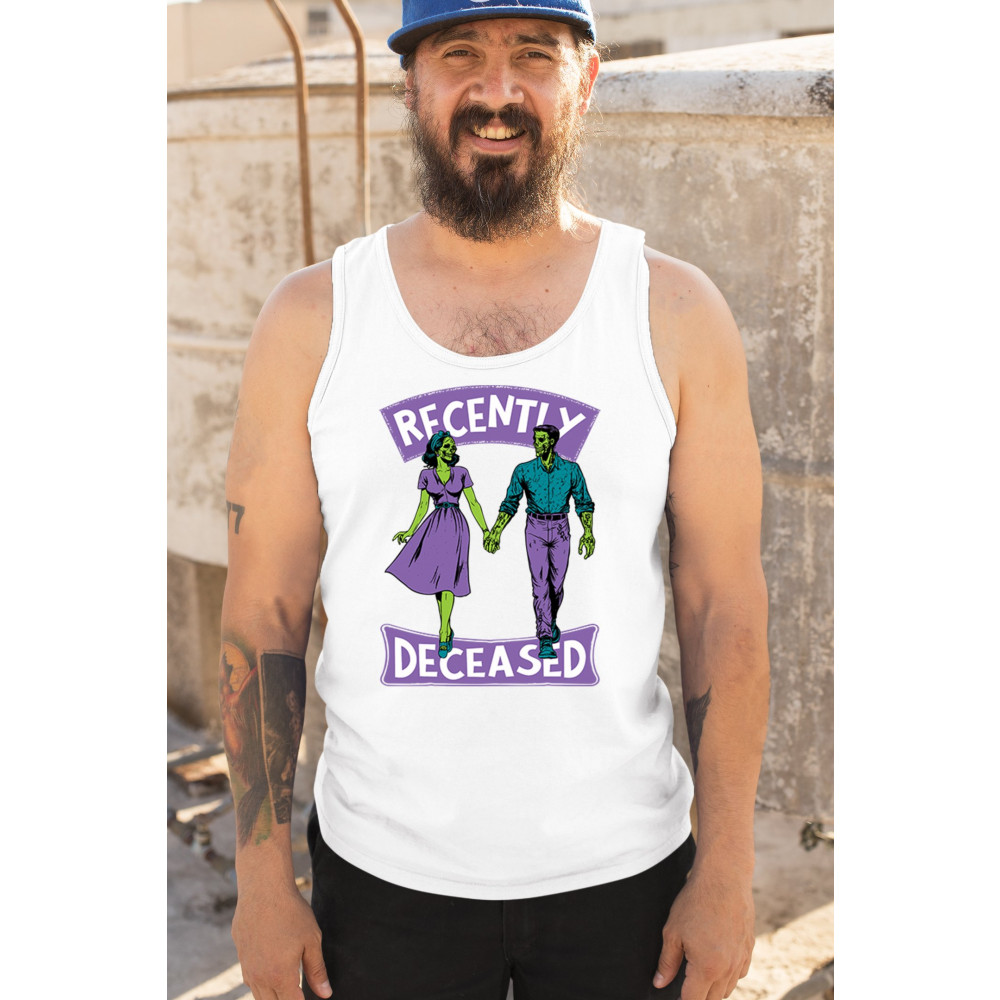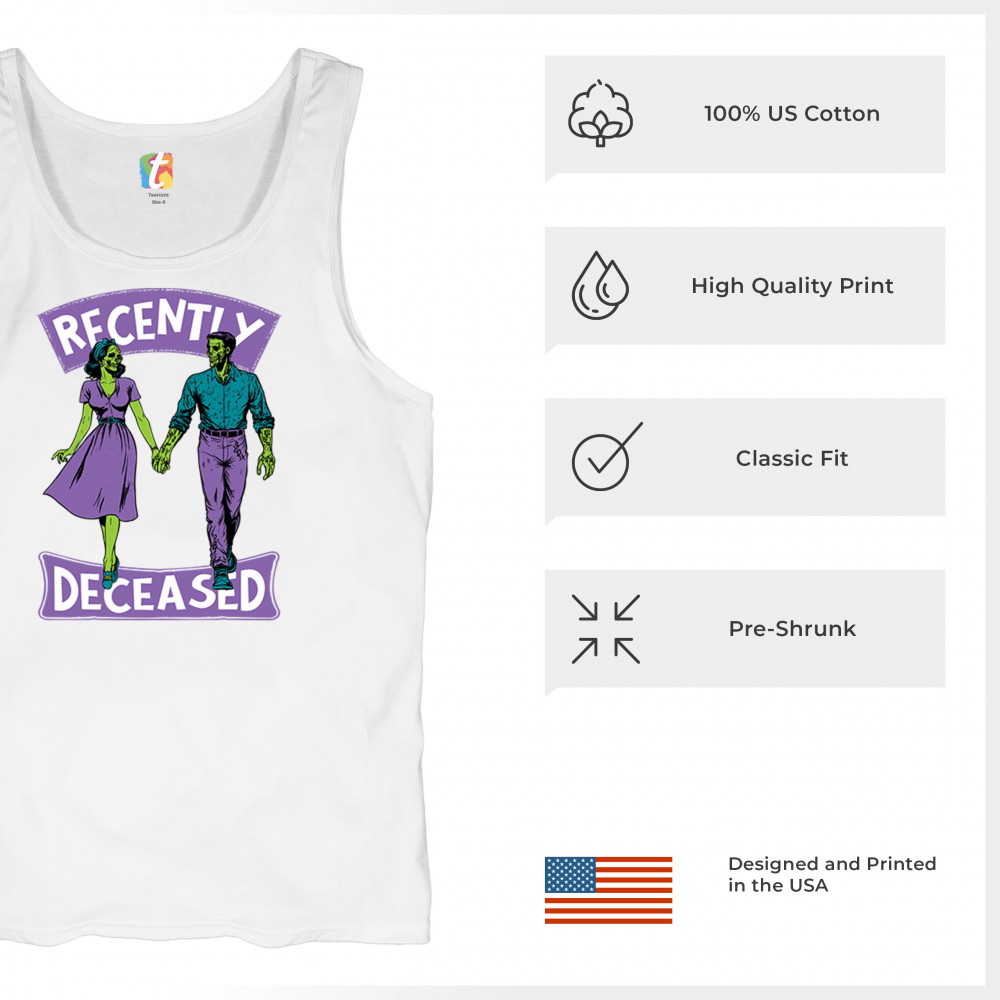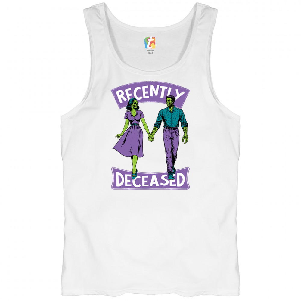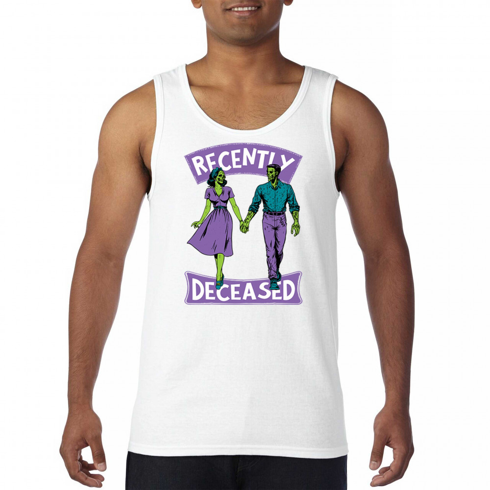 Recently Deceased zombie couple shirt with undead lovers design, spooky season humor, Halloween zombie outfit, and haunted house vibes.
