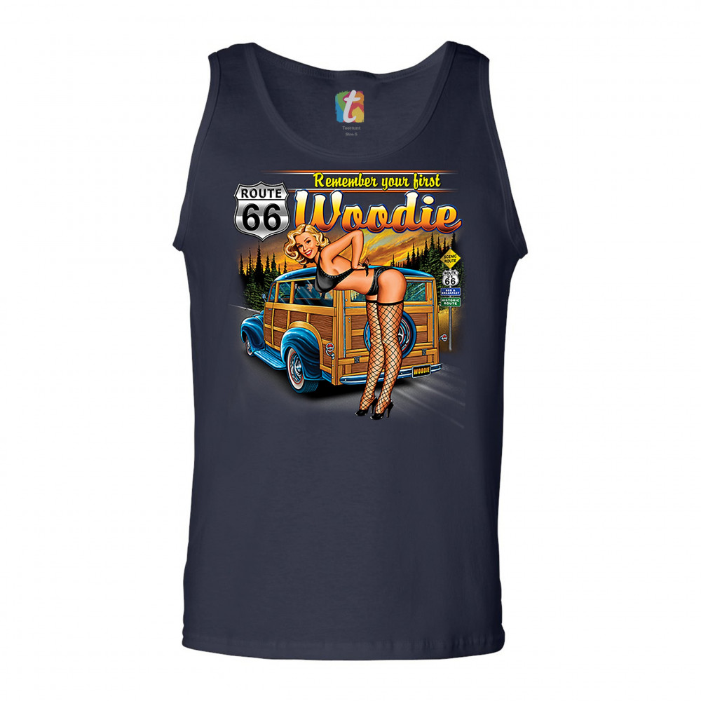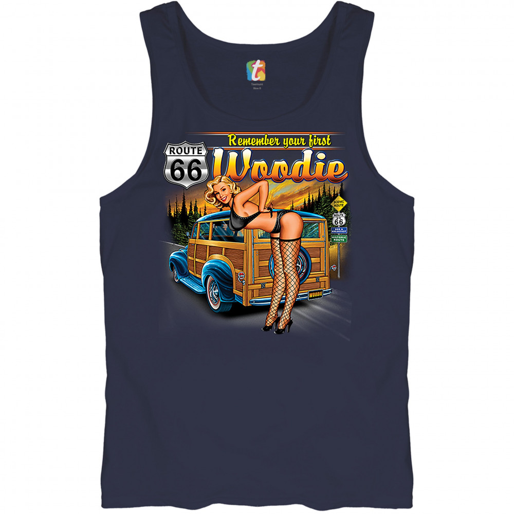 A print featuring a sexy blonde pin-up girl bending over and taking off her bra. Behind her there is a woodie wagon driving on a road. The print says: "Remeber your first woodie" and features a Route 66. A great choice for a fan of the legendary Mother Ro