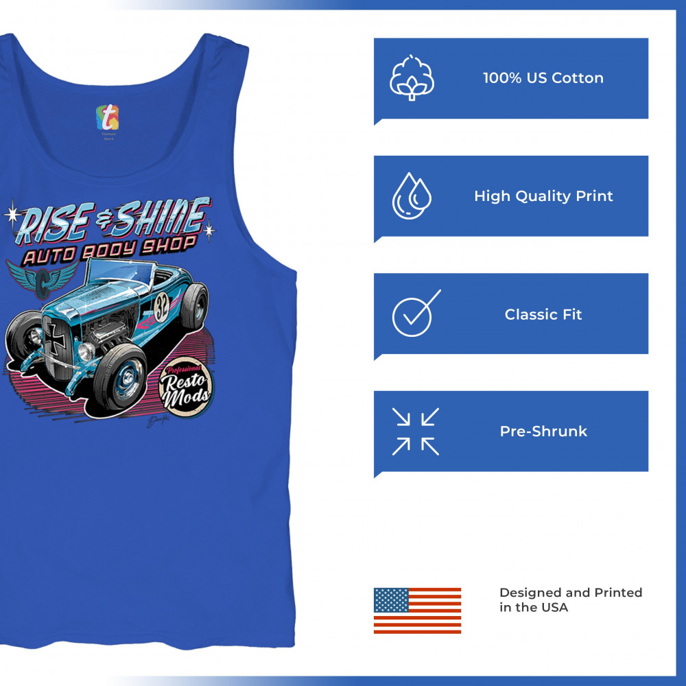 Celebrate vintage car culture with our "Rise & Shine Auto Body Shop" design. Perfect for car enthusiasts and auto restoration fans. Comfortable and durable.