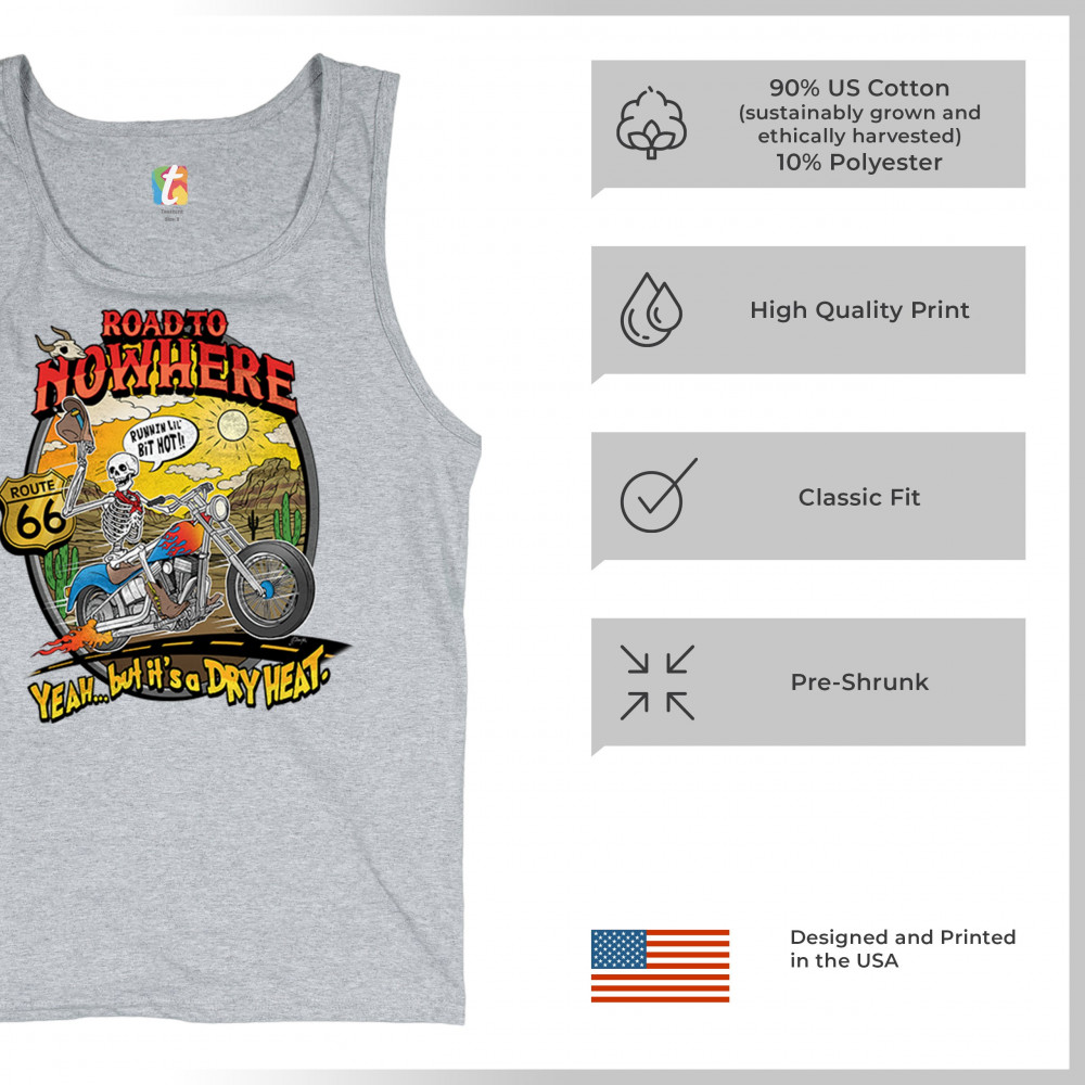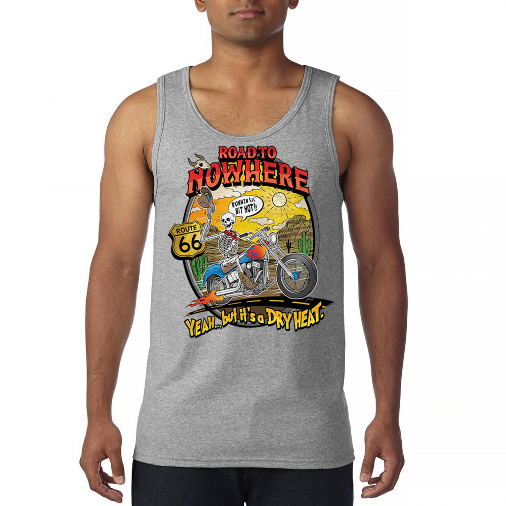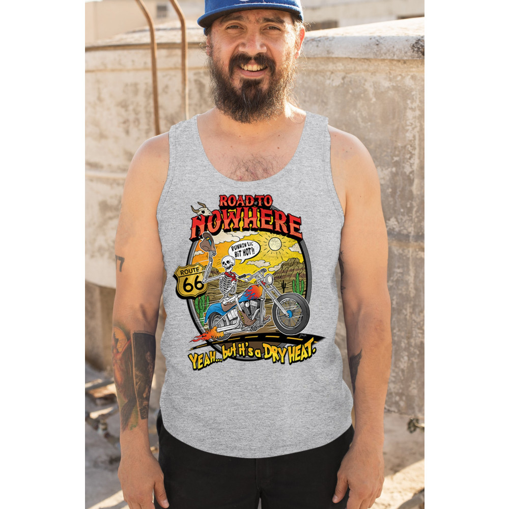 Our 'Road to Nowhere' tee is a salute to the thrill-seekers and the heat-bravers. Adorned with a bold skeleton cruising down Route 66, it embodies the spirit of adventure with a touch of playful defiance. A statement piece for anyone who lives for the ride and laughs in the face of danger. Join the ride into the sunset with this daring design.
