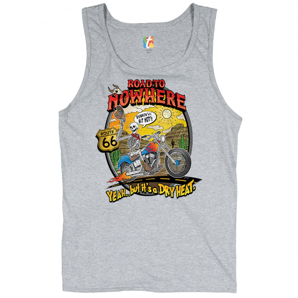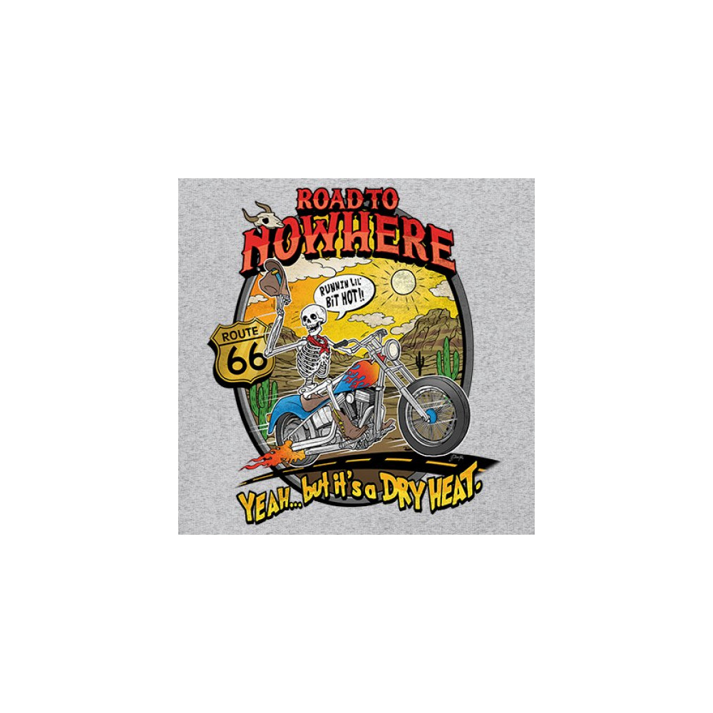 Discover the 'Road to Nowhere' T-shirt: a blend of bold graphics and adventurous spirit. Embrace the ride with our Route 66 skeleton biker design.