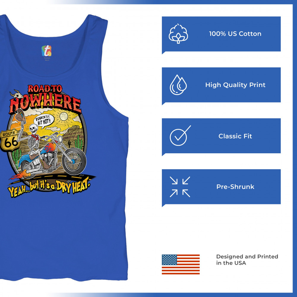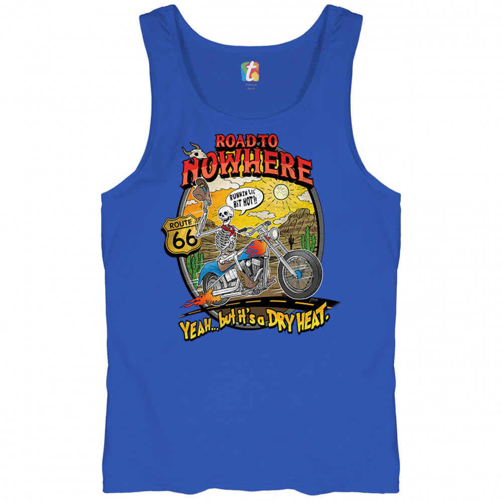 Discover the 'Road to Nowhere' T-shirt: a blend of bold graphics and adventurous spirit. Embrace the ride with our Route 66 skeleton biker design.