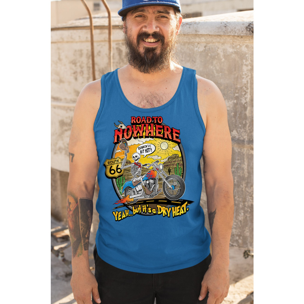 Our 'Road to Nowhere' tee is a salute to the thrill-seekers and the heat-bravers. Adorned with a bold skeleton cruising down Route 66, it embodies the spirit of adventure with a touch of playful defiance. A statement piece for anyone who lives for the ride and laughs in the face of danger. Join the ride into the sunset with this daring design.