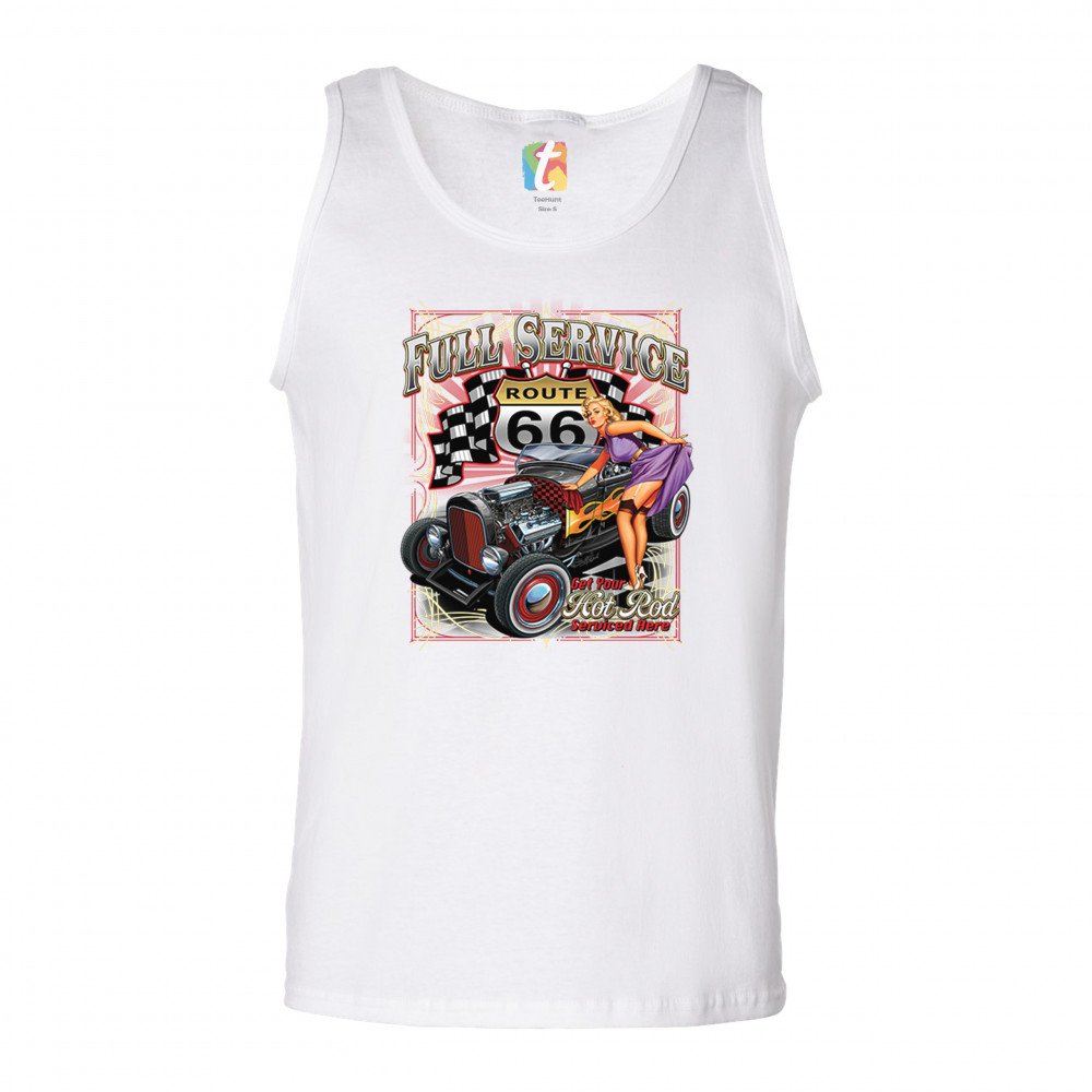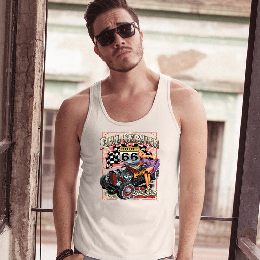 A print featuring a hot rod muscle car with flames painted on it's sides. There is a beautiful pin-up girl in stockings standing near it lifting her dress with one hand. The prints says: "full service" and "get your hot rod serviced here". In the background there is a Route 66 sign with racing flags to it's sides. Great for Route 66 and hot rod fans.