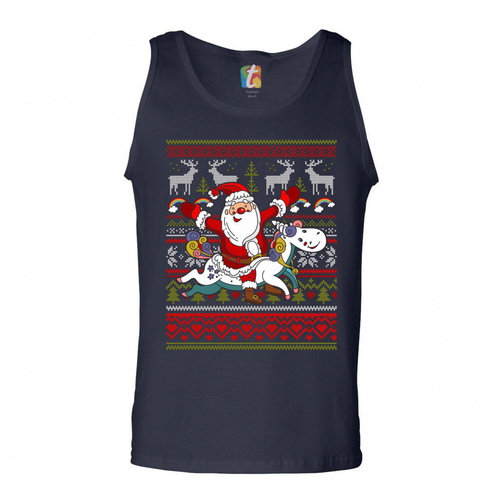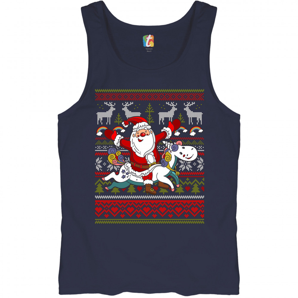 SANTA CLAUS RIDING A UNICORN tank top merry christmas ugly sweater men's top navy blue