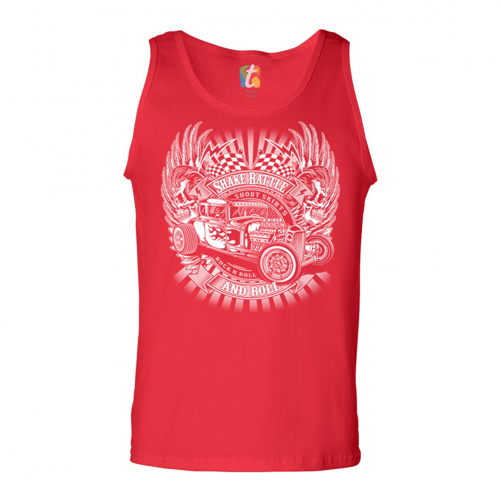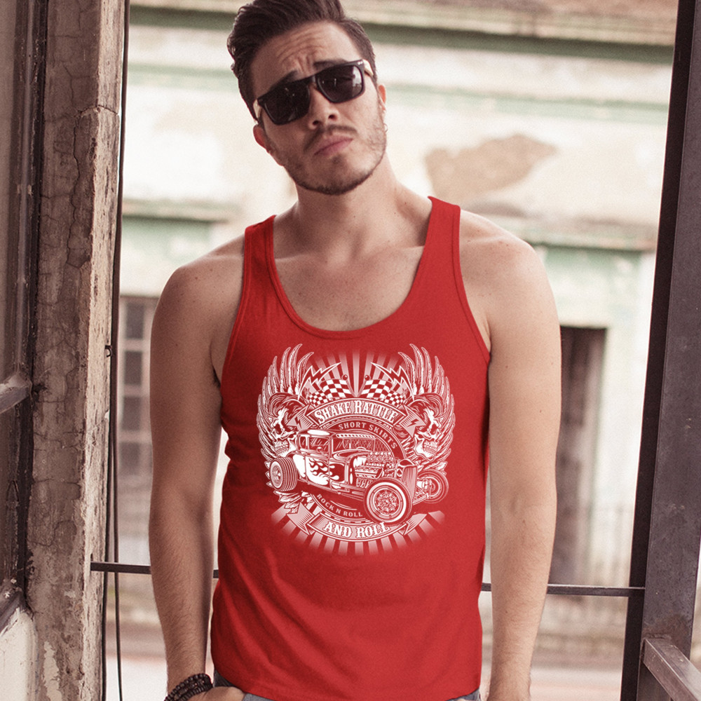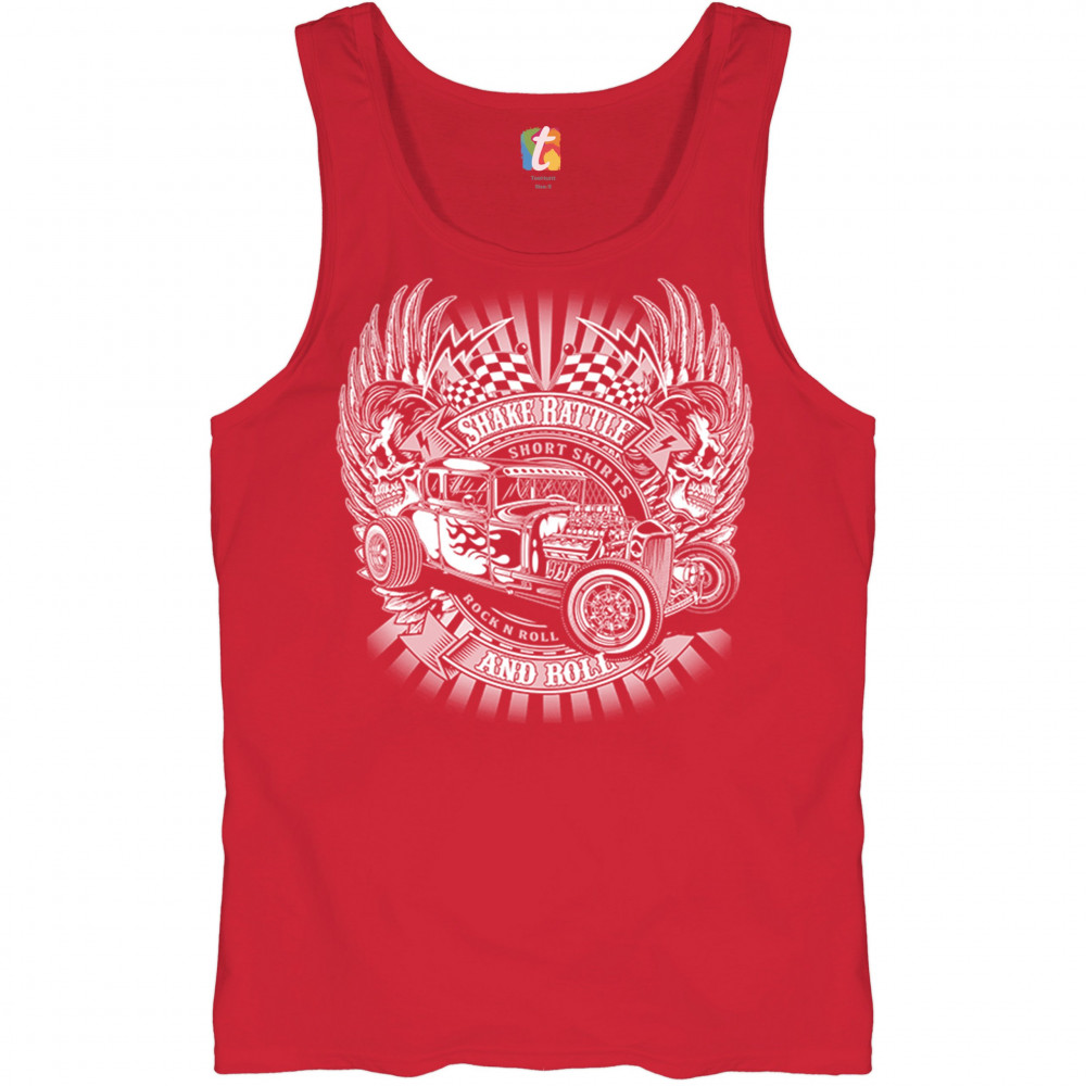 A print featuring a vintage hot rod with an exposed engine, a pair of skulls, wings and racing flags. On several stripes it says: "Shake rattle and roll", "short skirts" and "rock and roll". A great choice for a fan of customized American classic cars and