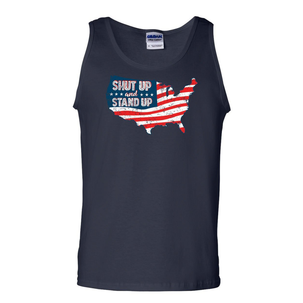 SHUT UP AND STAND UP tank top anthem usa map maga flag patriotic sleeveless navy blue