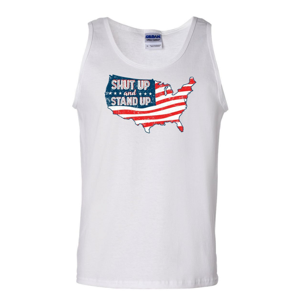 SHUT UP AND STAND UP tank top anthem usa map maga flag patriotic sleeveless white