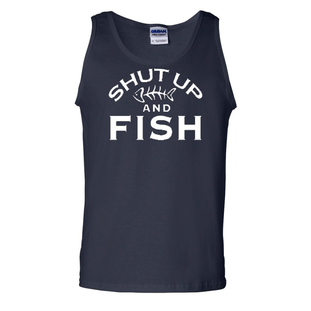 SHUT UP AND FISH tank top funny fishing muscle shirt navy blue