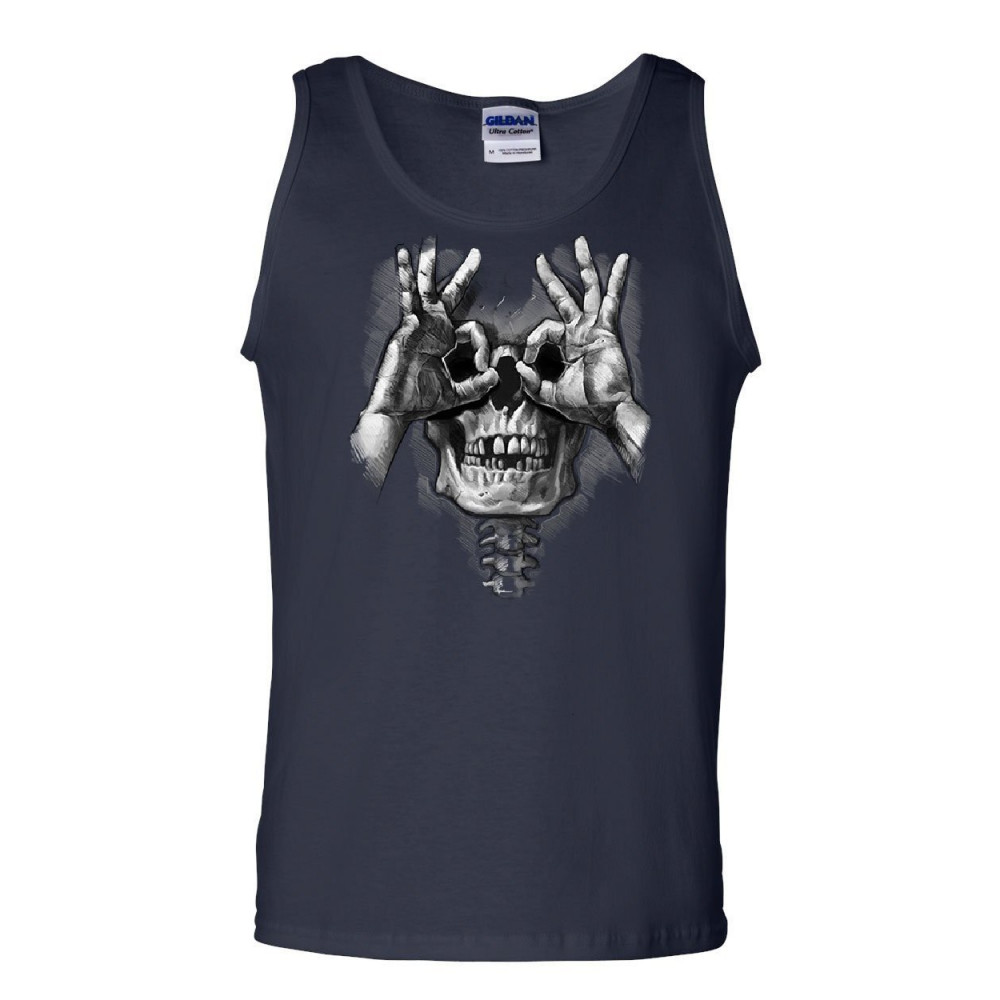 SKULL FACE HAND GOGGLES tank top funny dead eye staring skeleton sleeveless navy blue
