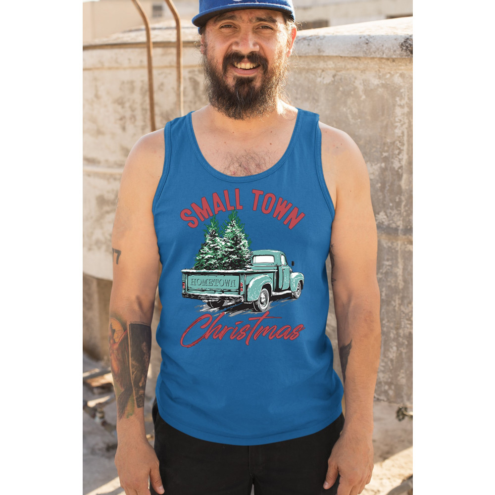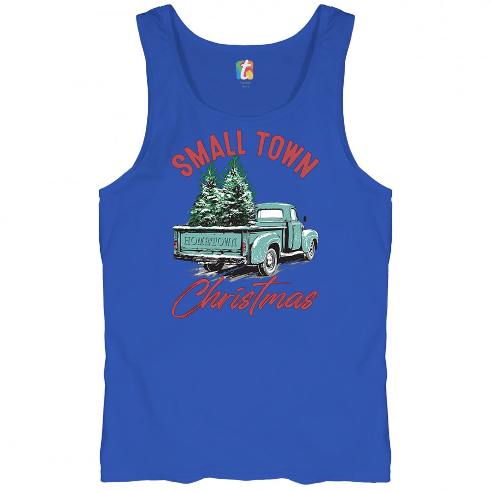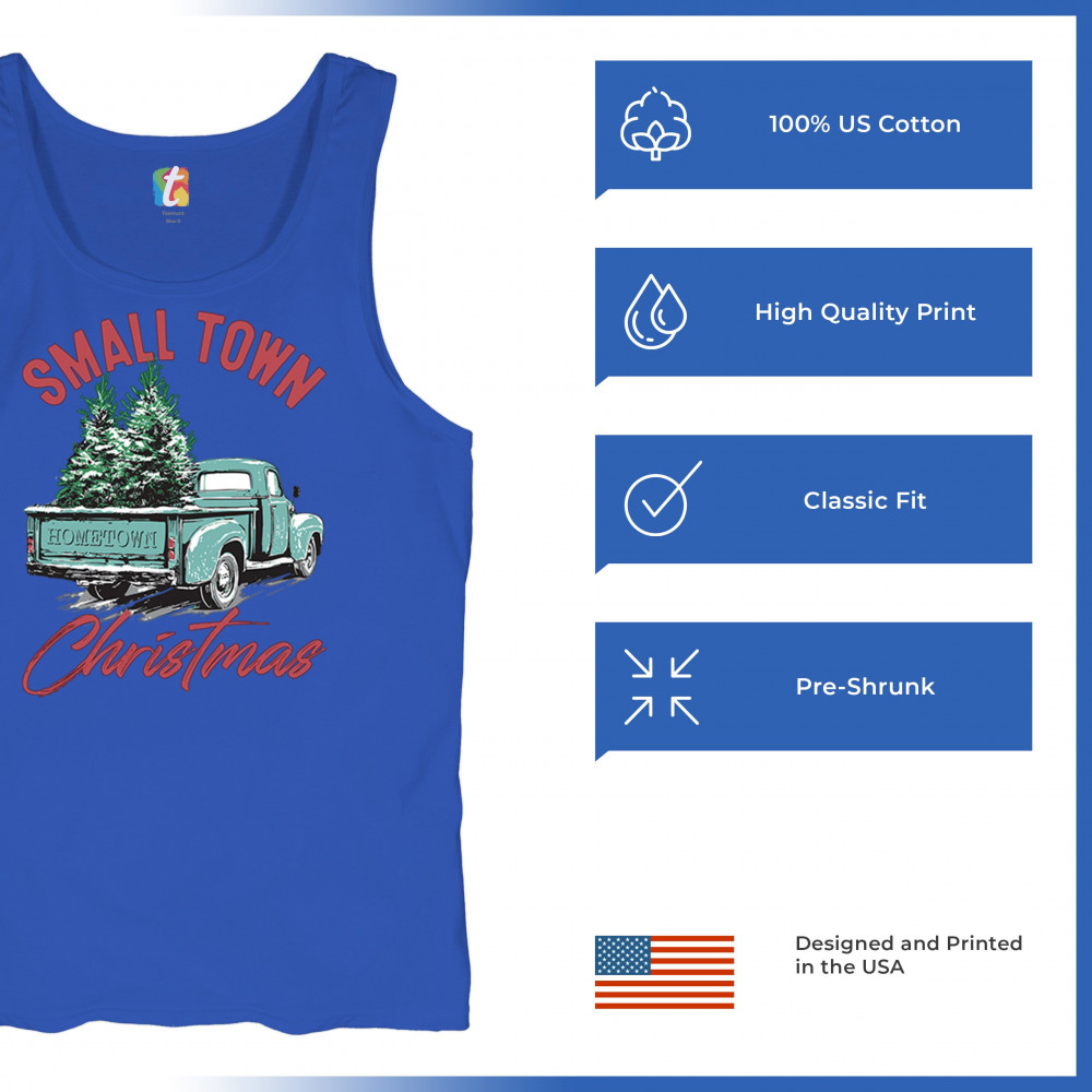 Embrace holiday nostalgia with this "Small Town Christmas" design featuring a vintage truck and Christmas trees. Perfect for rustic decor lovers.