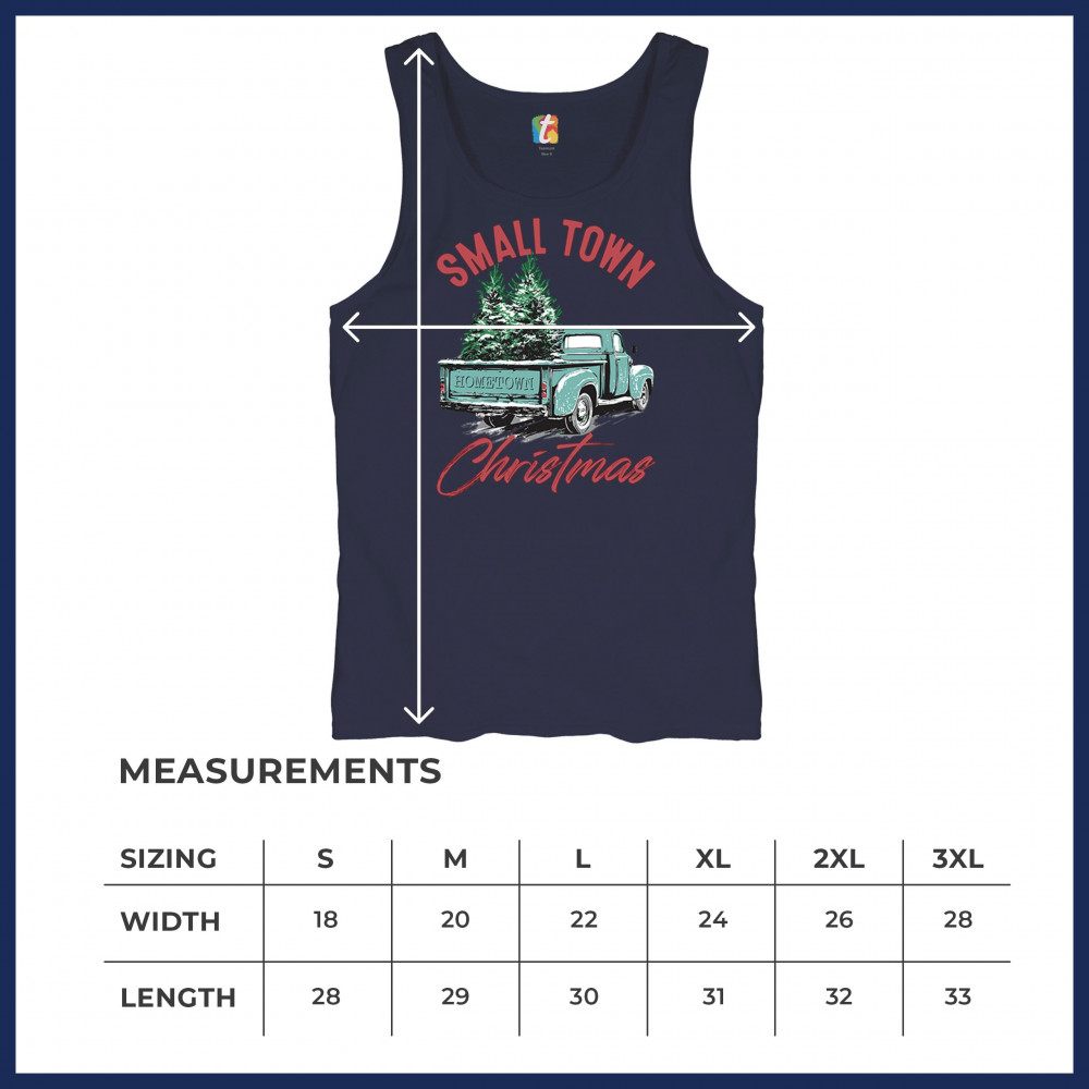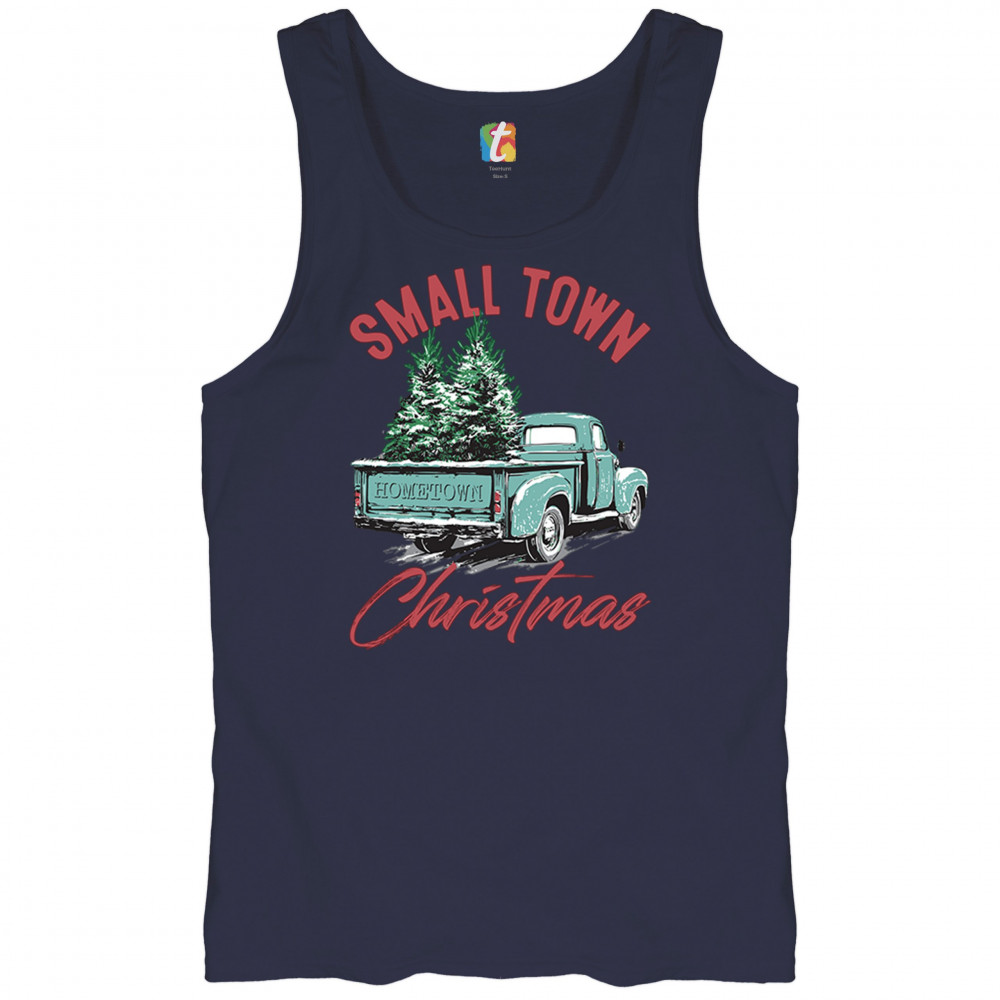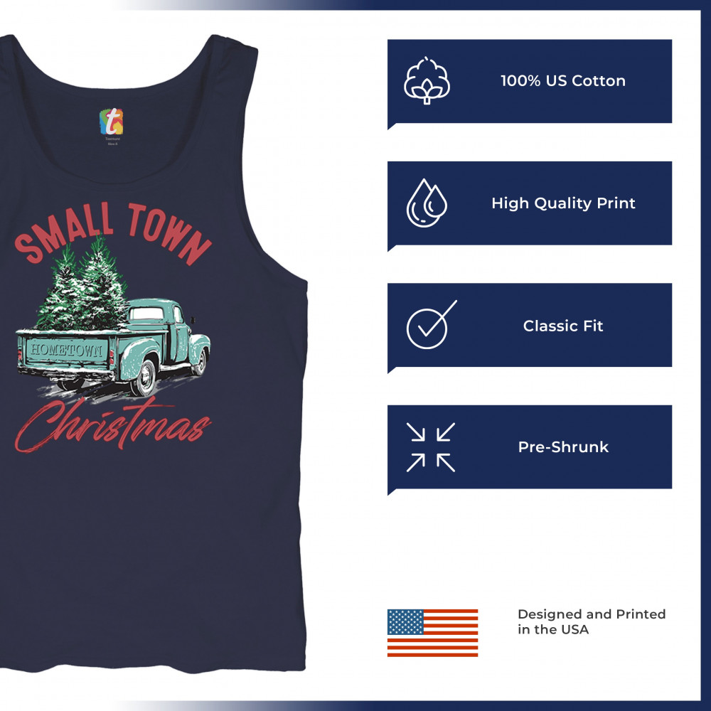 Embrace holiday nostalgia with this "Small Town Christmas" design featuring a vintage truck and Christmas trees. Perfect for rustic decor lovers.