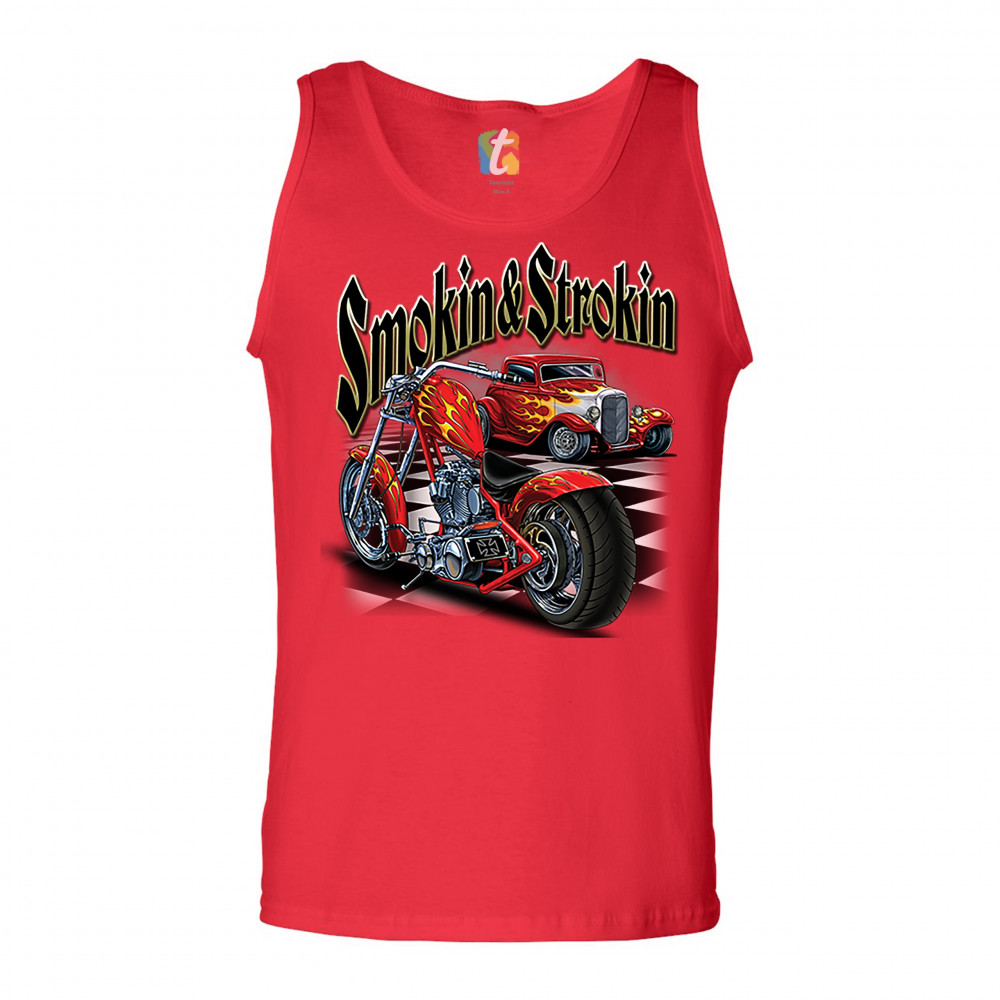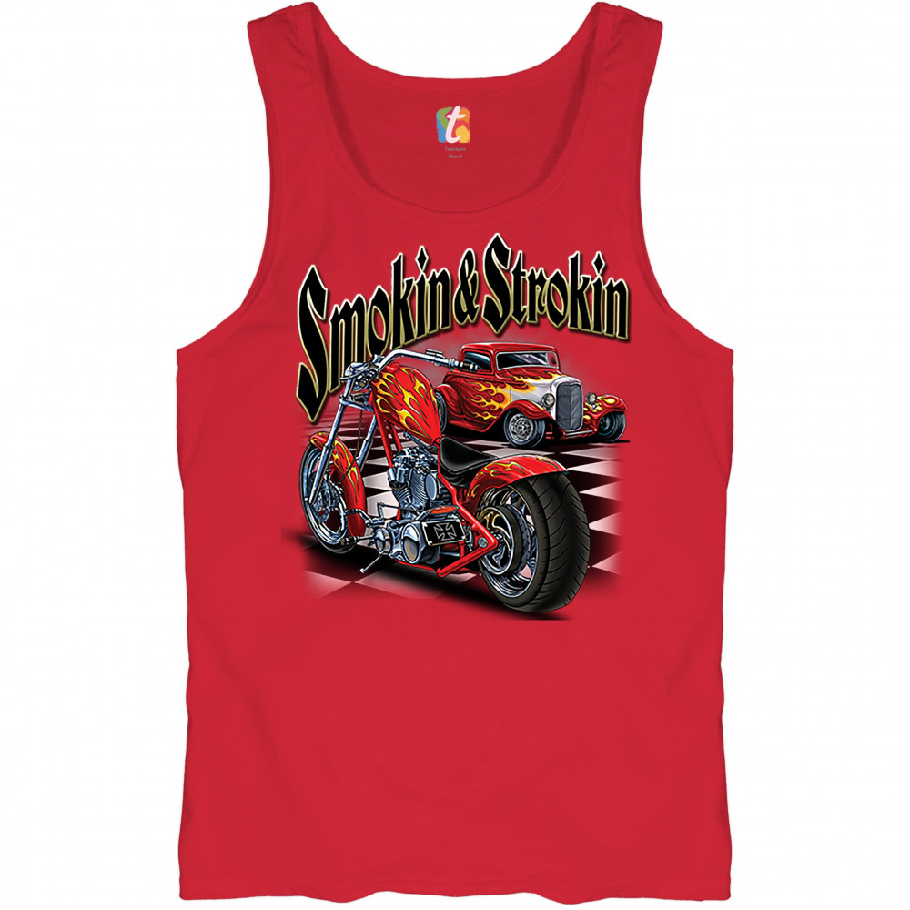 A print featuring a hot rod and a chopper motorcycle standing on a chess board, both covered with flame paint jobs. The print says: "Smoking & Strokin". A great choice for a fan of customized American classic cars, hot rods and motorcycles.