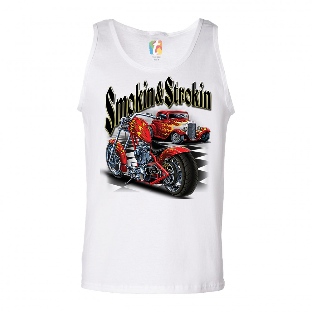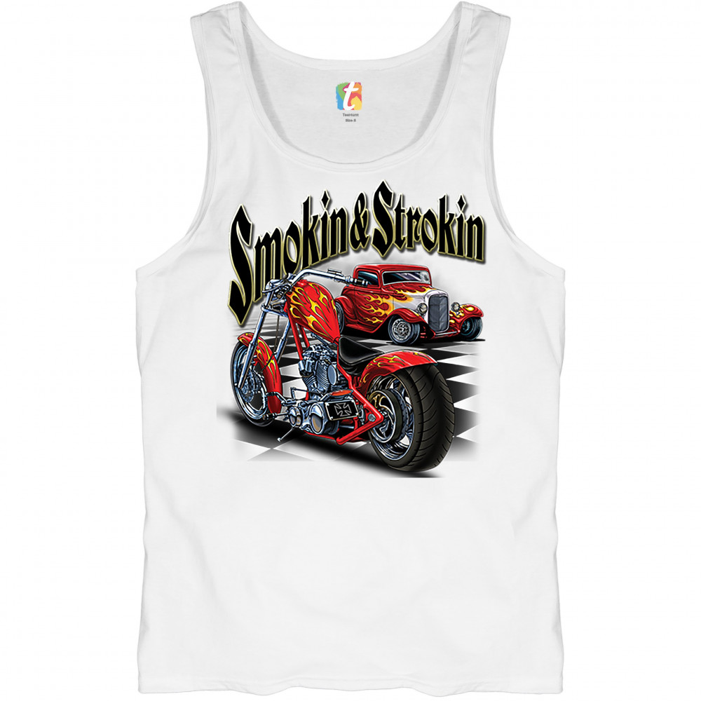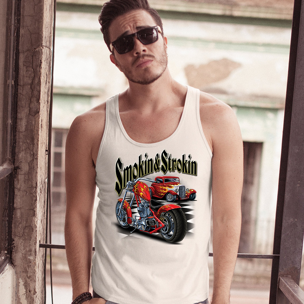 A print featuring a hot rod and a chopper motorcycle standing on a chess board, both covered with flame paint jobs. The print says: "Smoking & Strokin". A great choice for a fan of customized American classic cars, hot rods and motorcycles.