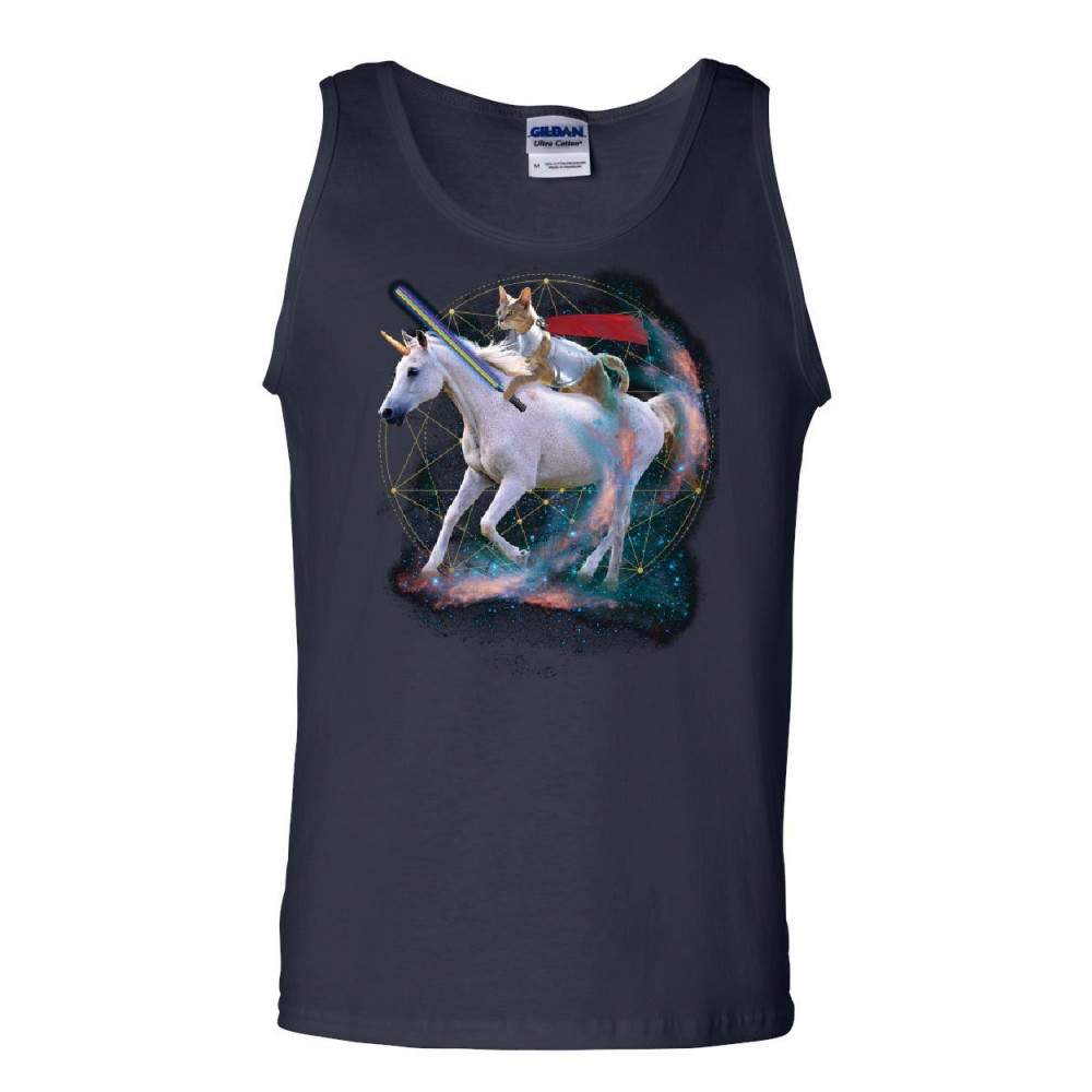 SPACE CAT RIDING A UNICORN with a saber tank top weird universe sleeveless navy blue