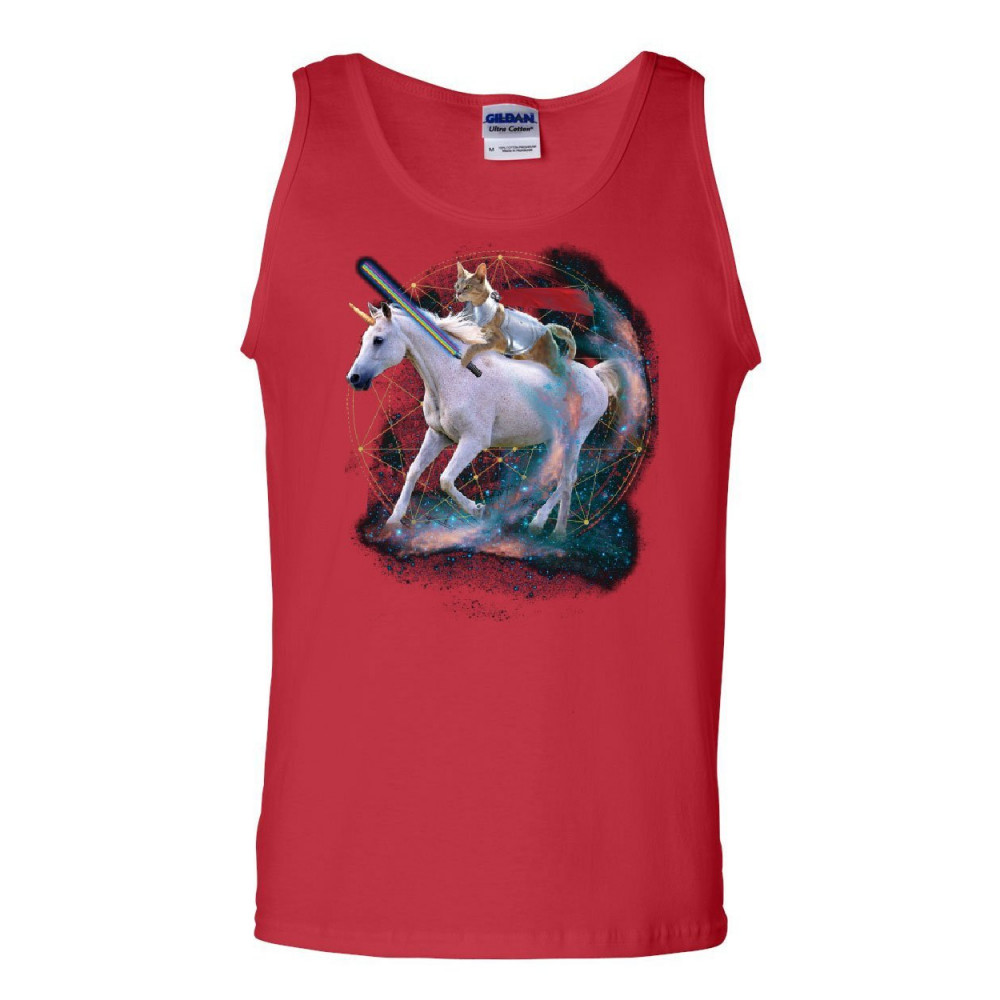 SPACE CAT RIDING A UNICORN with a saber tank top weird universe sleeveless red