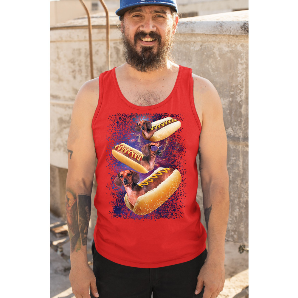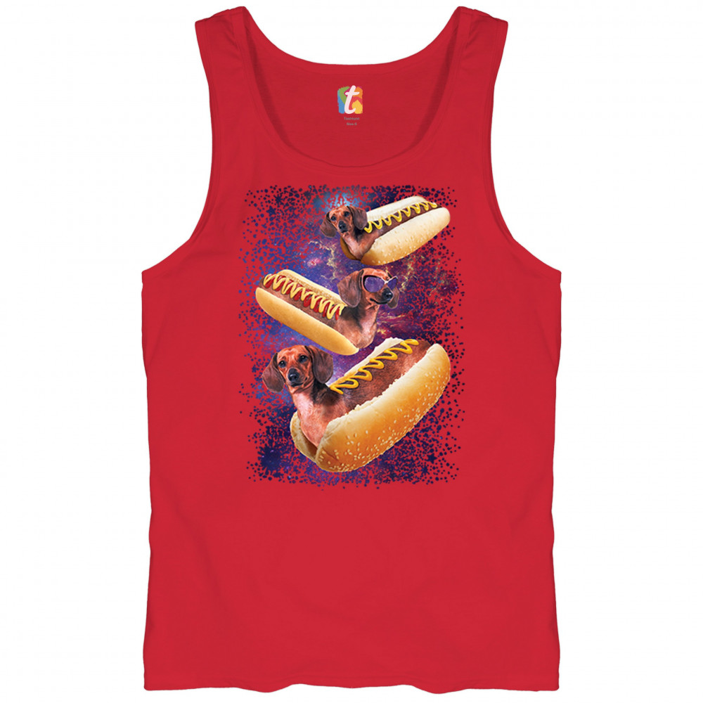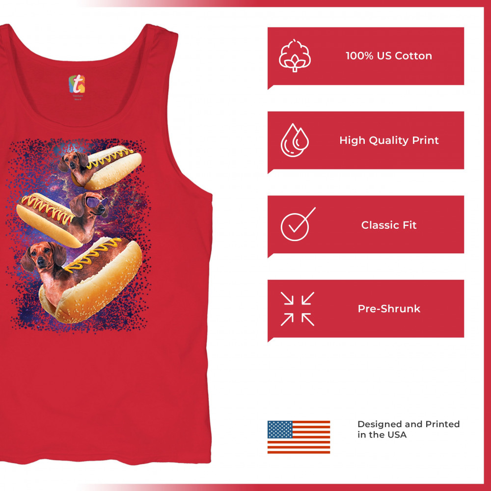 Quirky and fun tee featuring dachshunds as hotdogs in a cosmic setting. Perfect for dog and space lovers. Comfortable and durable.