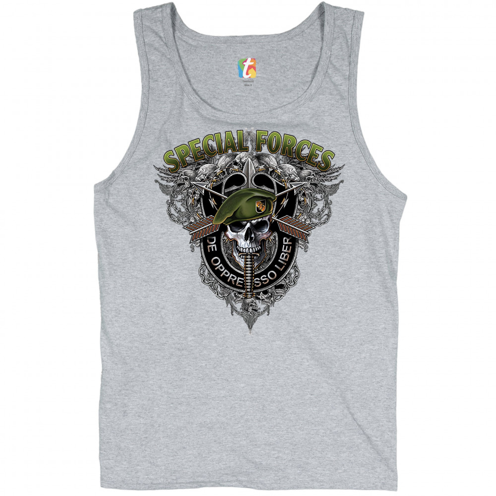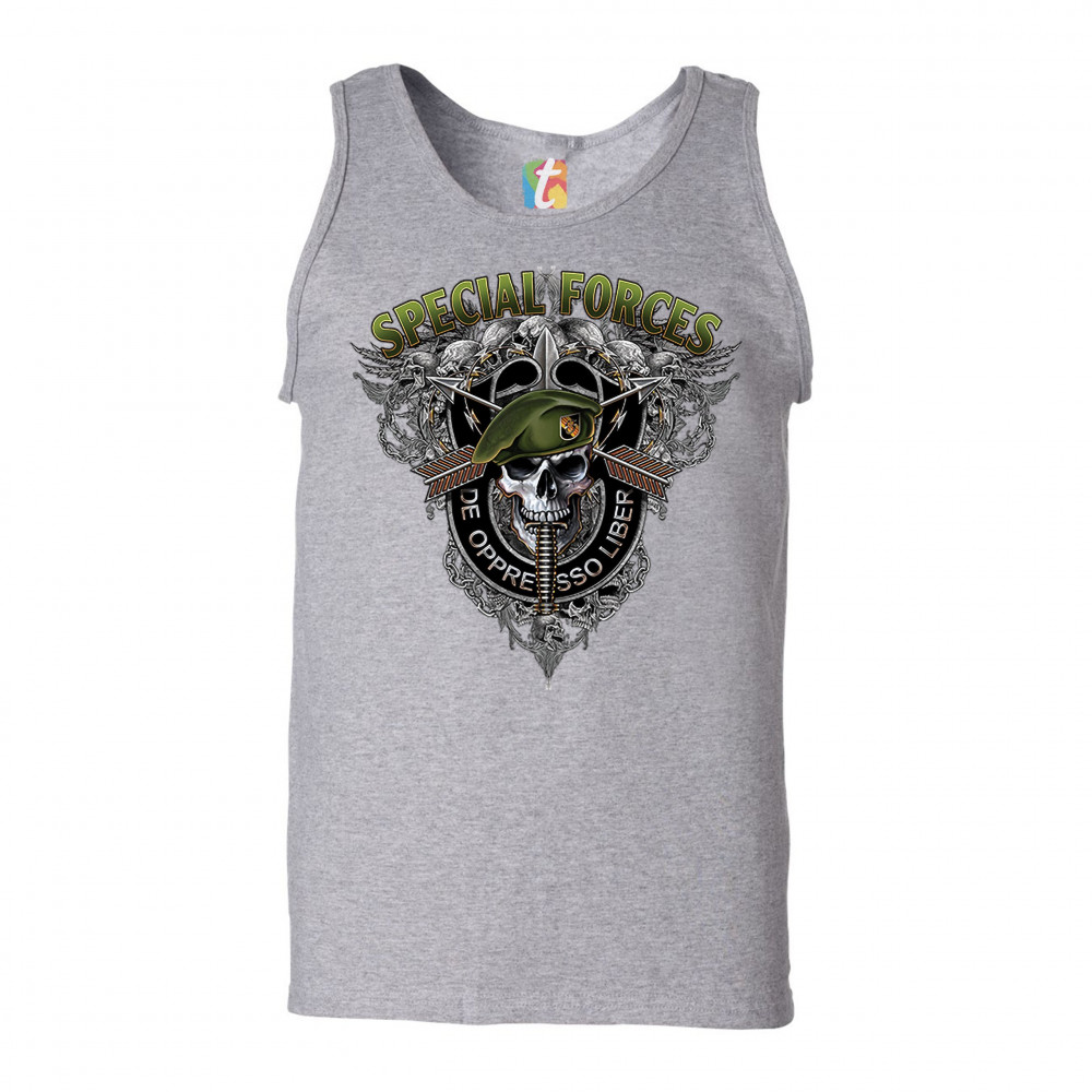 A patriotic print featuring a skull wearing a green beret with a dagger in it's mouth. At the top the print says: "Special Forces". Around the skull there is a black stripe with the special forces' slogan written on it: "de oppresso liber". In the backgro
