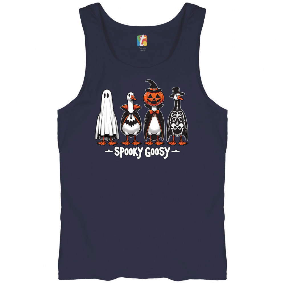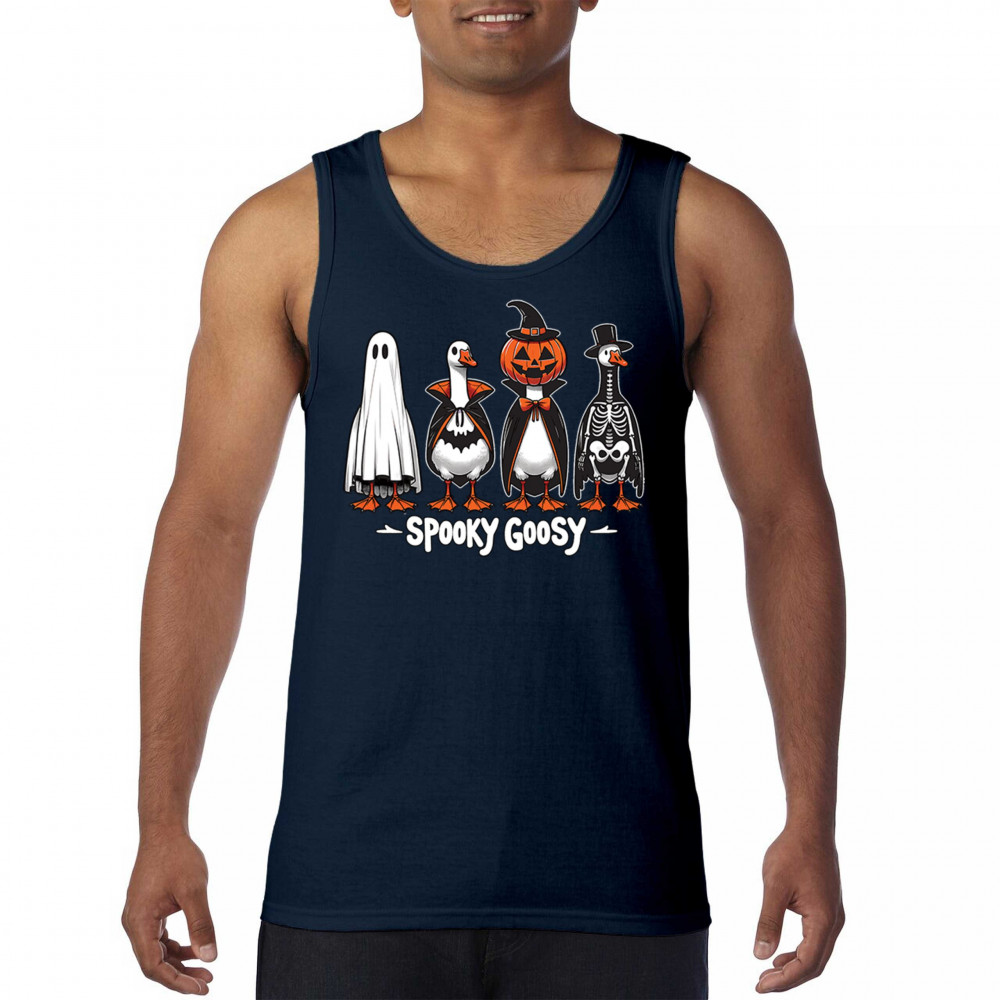 Spooky Goosy Halloween design with geese in witch, skeleton, vampire, and pumpkin costumes. Perfect for October 31, haunted house, and scary night fun.