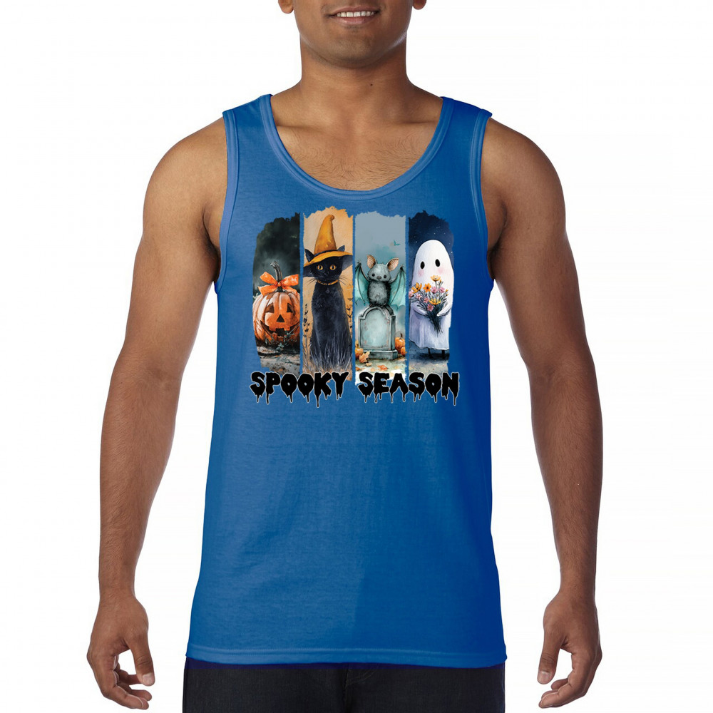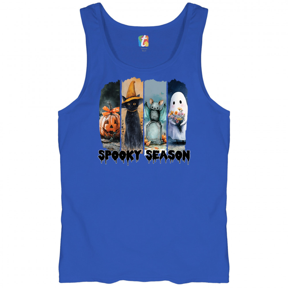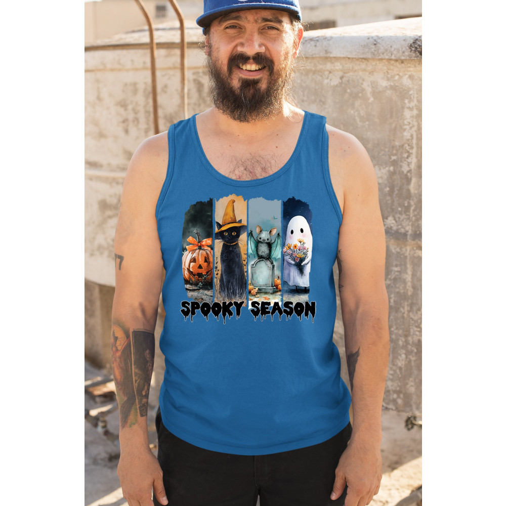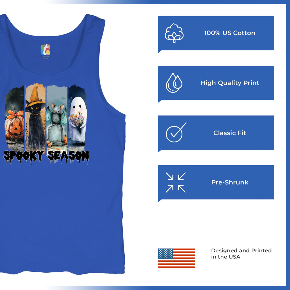 Spooky Season design with scary black cat, jack o lantern, haunted ghost house, and cute ghost. Perfect for October 31, trick or treat, and fall fun.