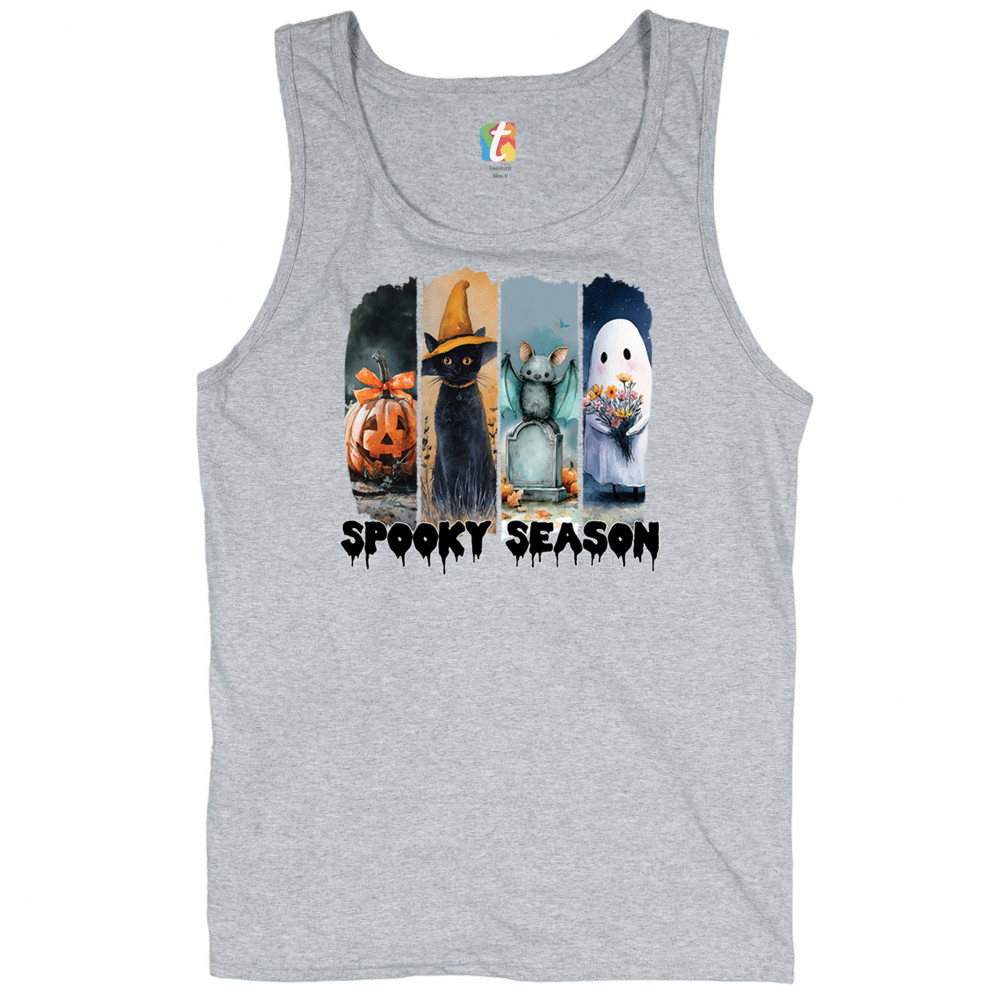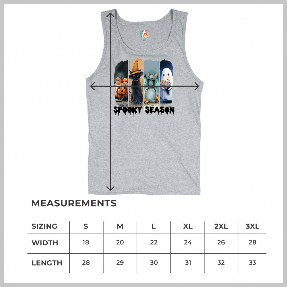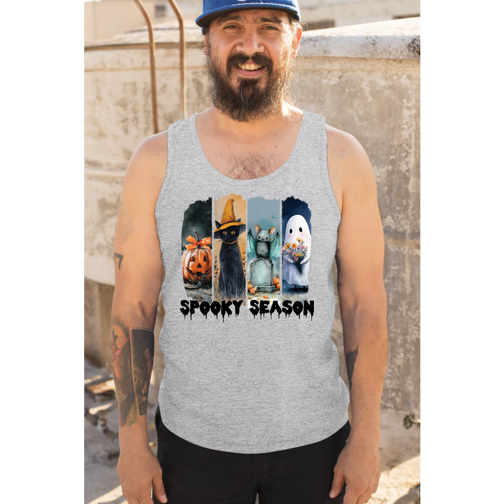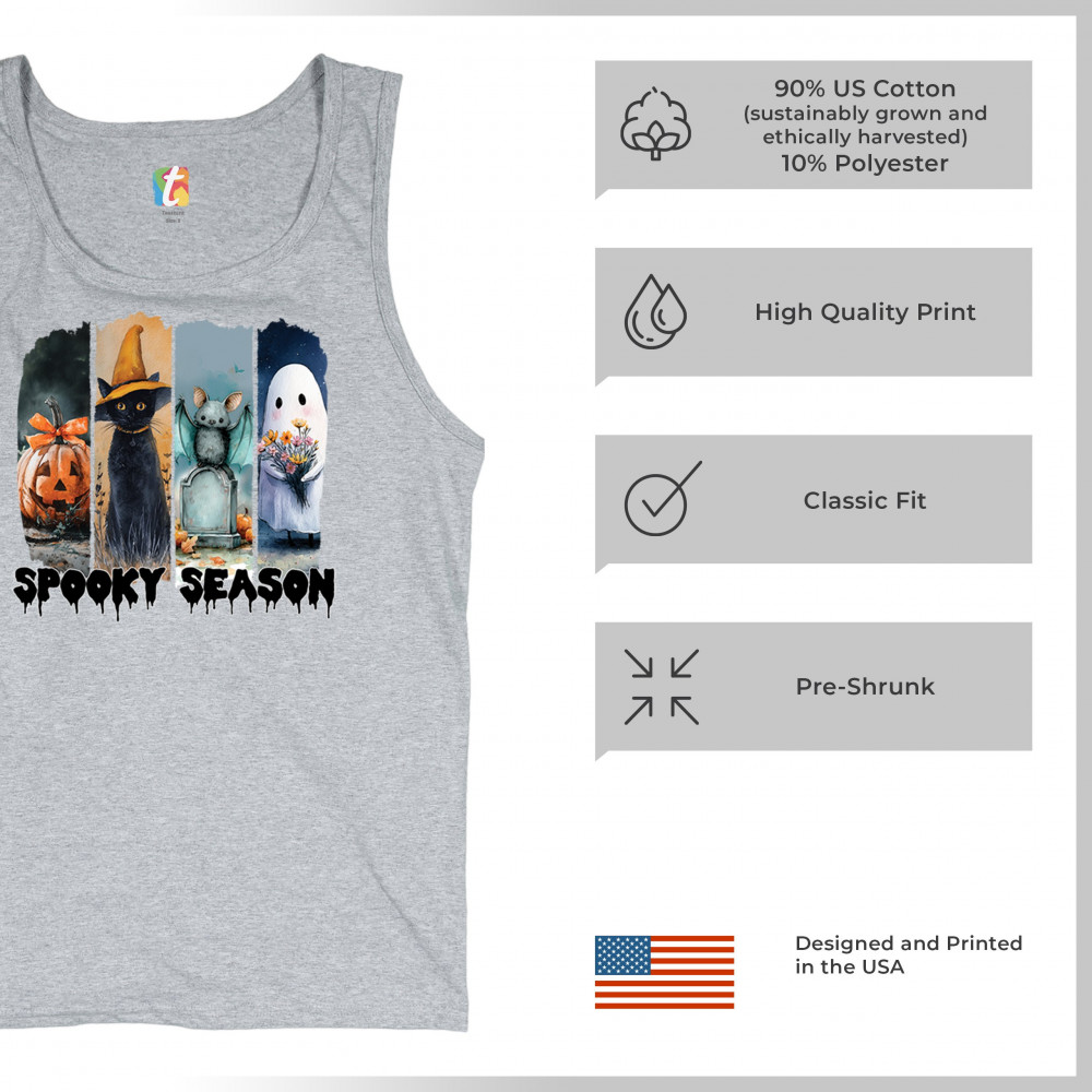 Spooky Season design with scary black cat, jack o lantern, haunted ghost house, and cute ghost. Perfect for October 31, trick or treat, and fall fun.