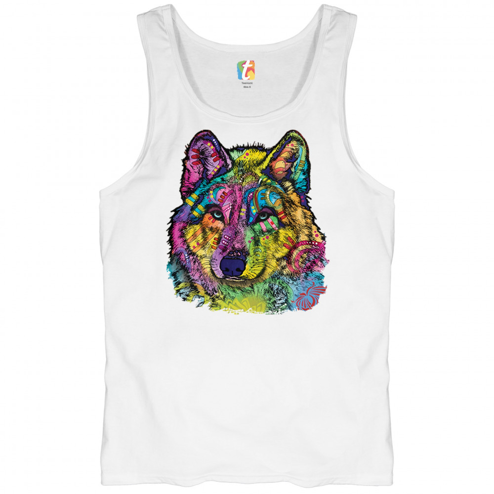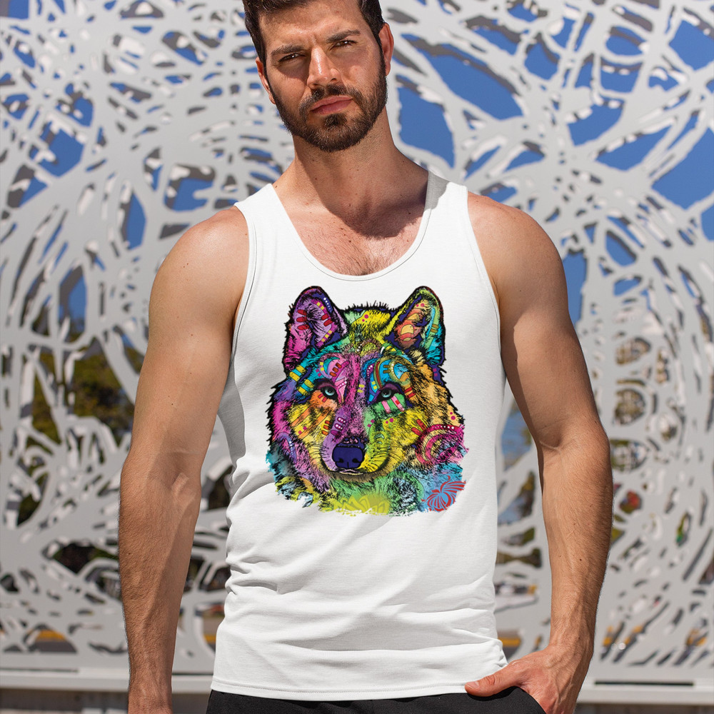 STARE OF THE WOLF tank top dean russo colorful neon animal art men's top white