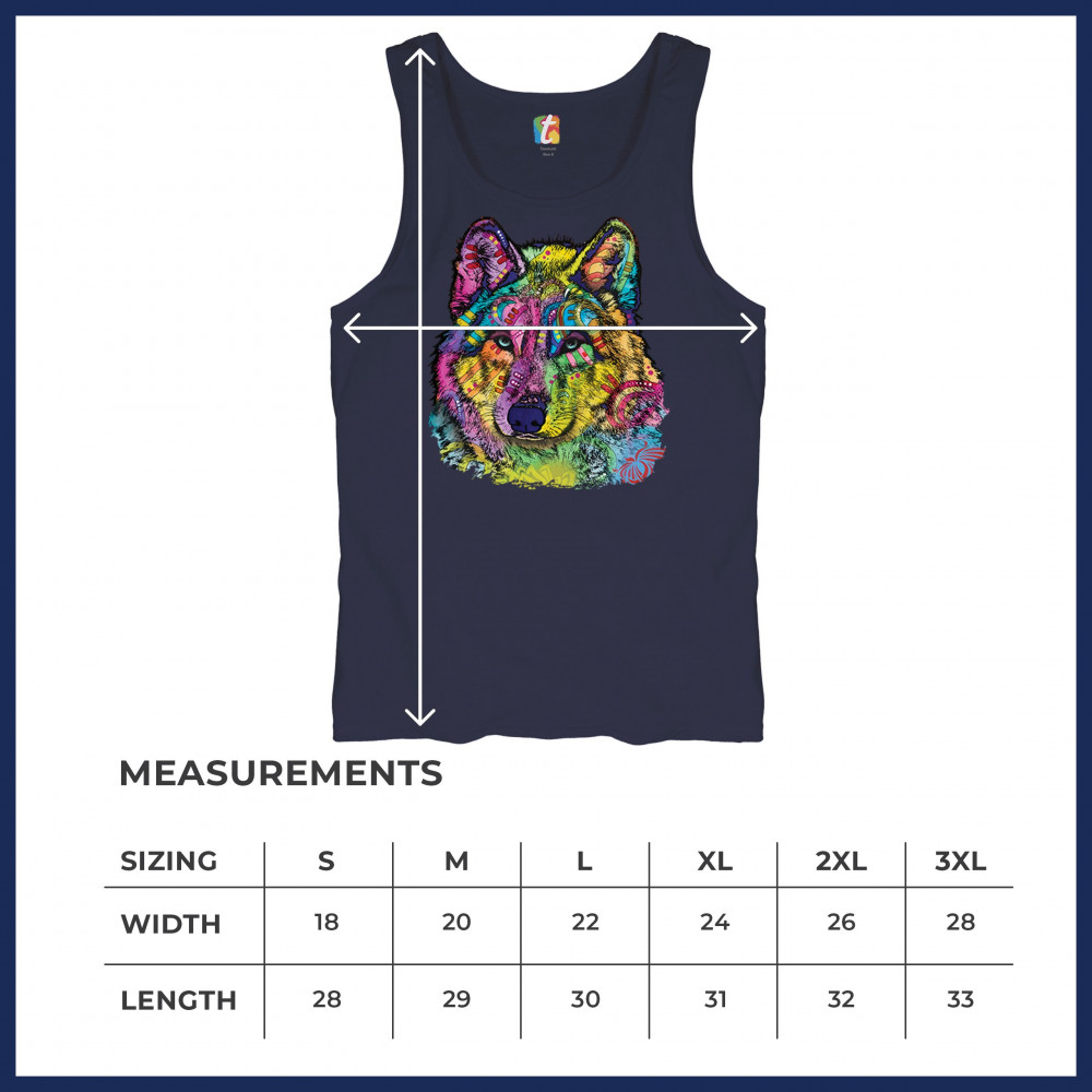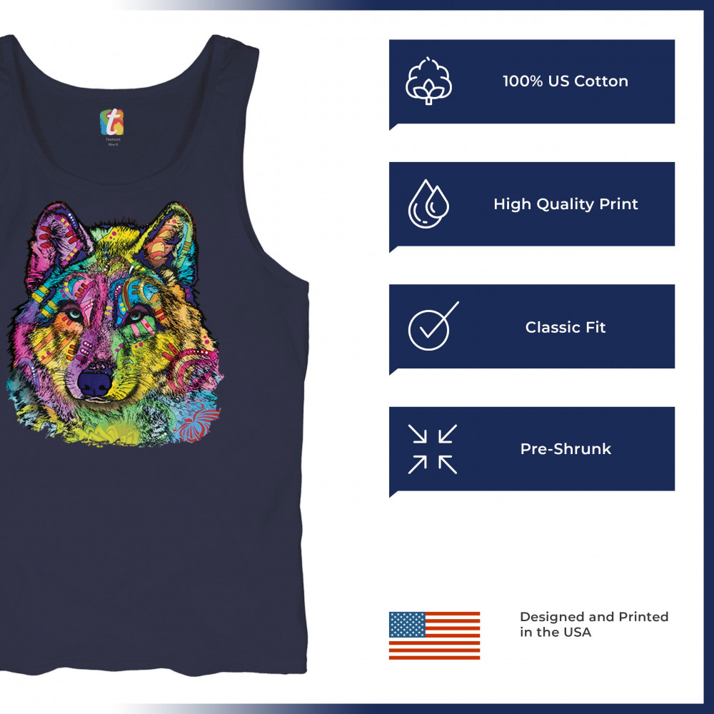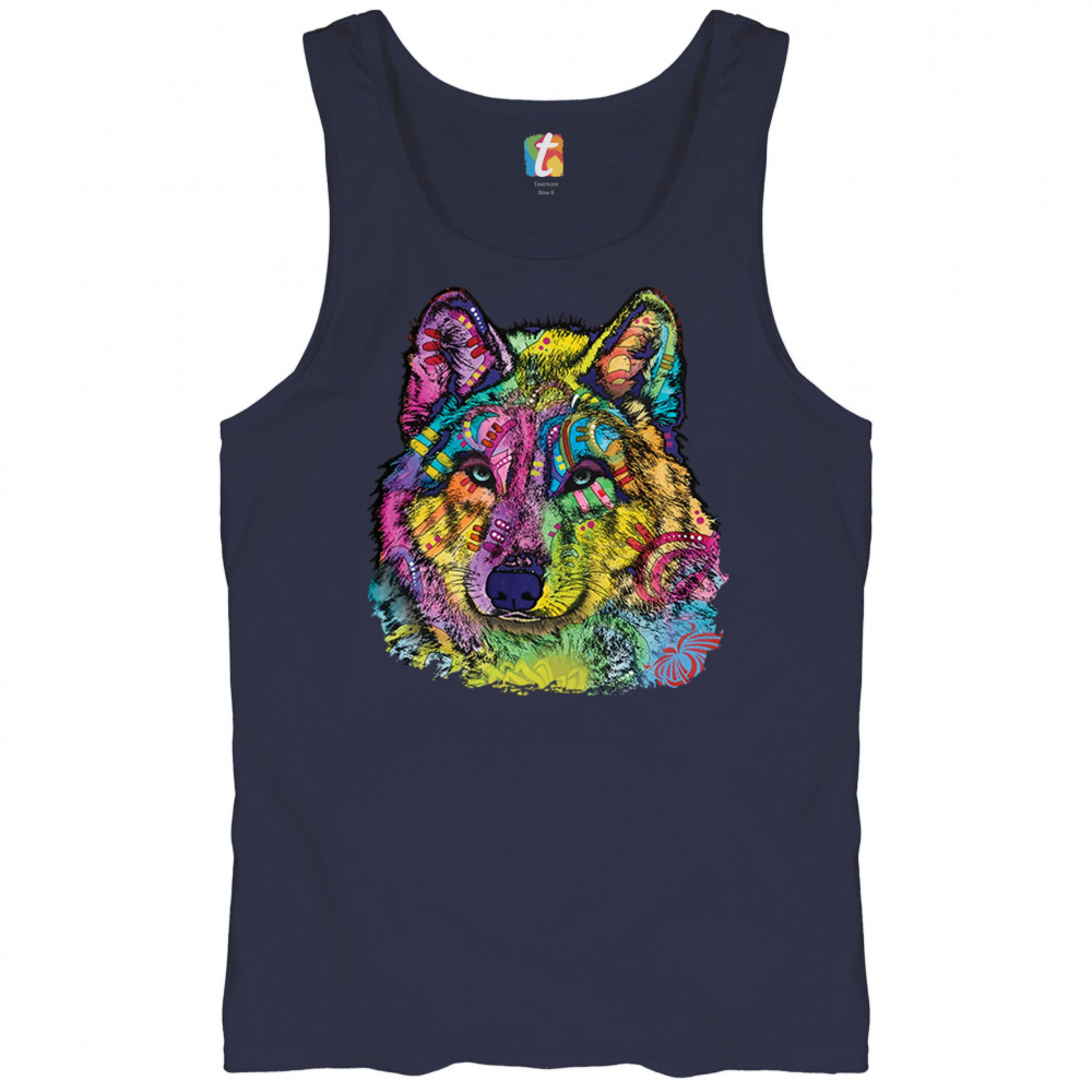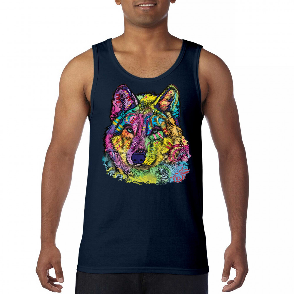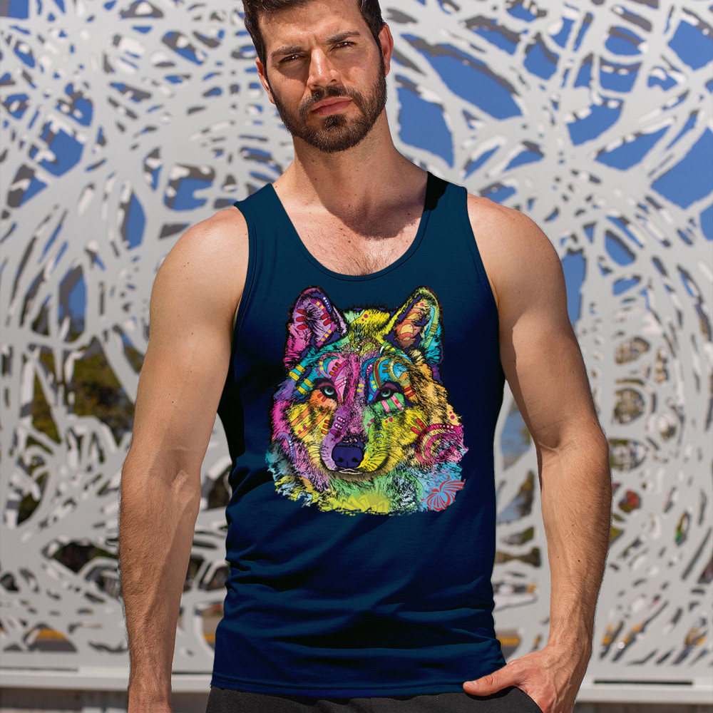 STARE OF THE WOLF tank top dean russo colorful neon animal art men's top navy blue