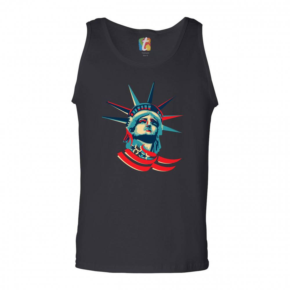 A patriotic print featuring a dripping silhouette of a bald eagle. The body is painted blue with lots of stars on it and the feathers of the wings, painted red, resemble the stripes of the American Flag. Over the wings there is a text written: "Land of the free home of the brave". Great choice to wear on Independence Day or any other patriotic holiday.