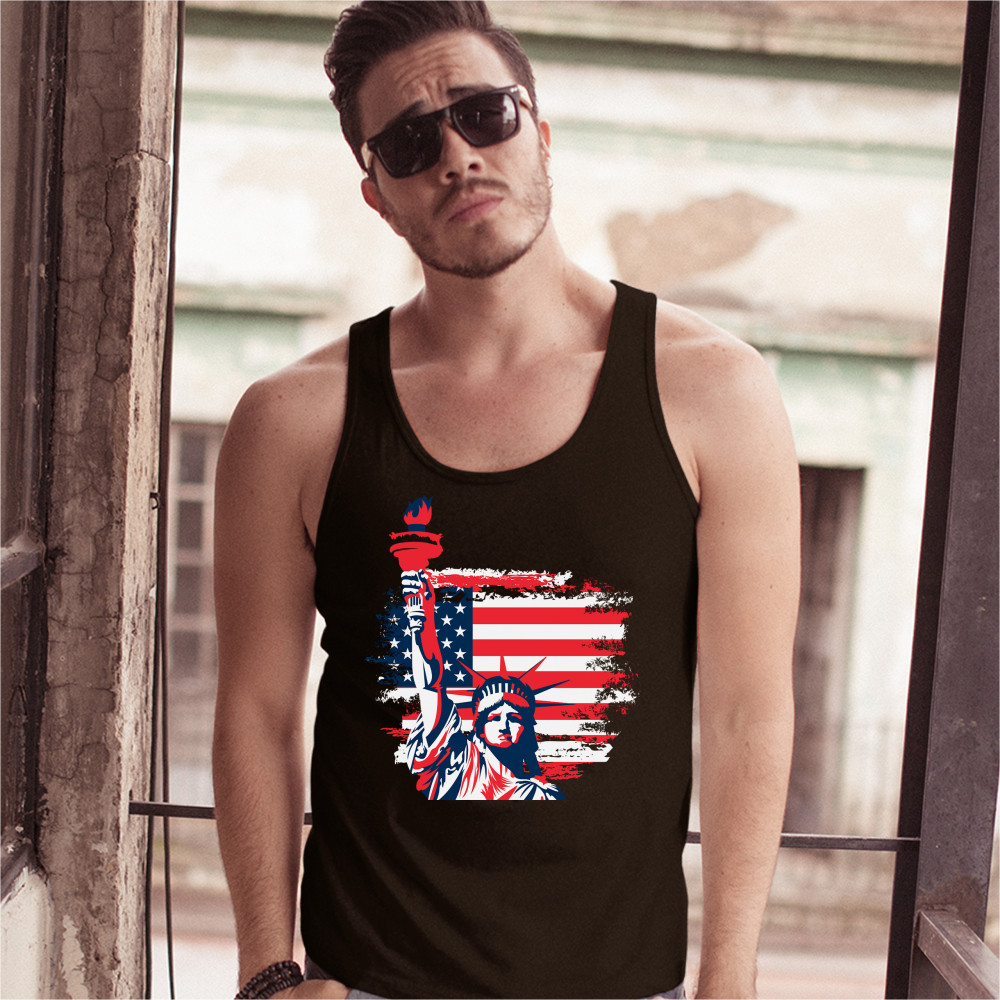 A patriotic print featuring a dripping silhouette of a bald eagle. The body is painted blue with lots of stars on it and the feathers of the wings, painted red, resemble the stripes of the American Flag. Over the wings there is a text written: "Land of the free home of the brave". Great choice to wear on Independence Day or any other patriotic holiday.