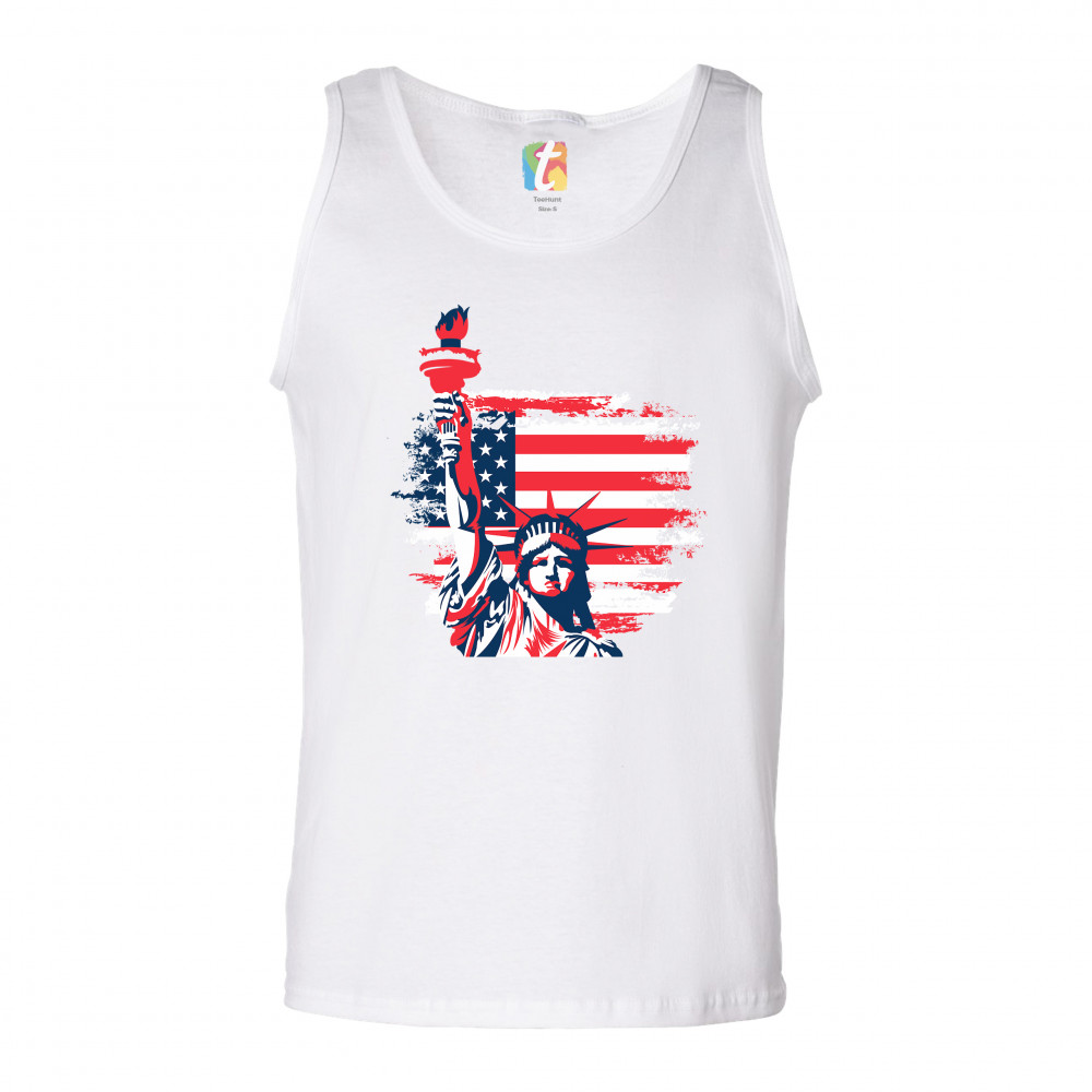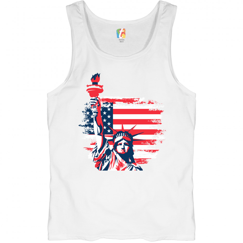 A patriotic print featuring a dripping silhouette of a bald eagle. The body is painted blue with lots of stars on it and the feathers of the wings, painted red, resemble the stripes of the American Flag. Over the wings there is a text written: "Land of the free home of the brave". Great choice to wear on Independence Day or any other patriotic holiday.