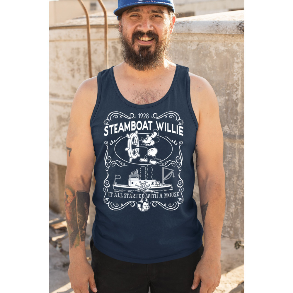 Set sail through the annals of animation as Steamboat Willie commands the vessel, echoing the timeless refrain, 'It all began with a mouse.