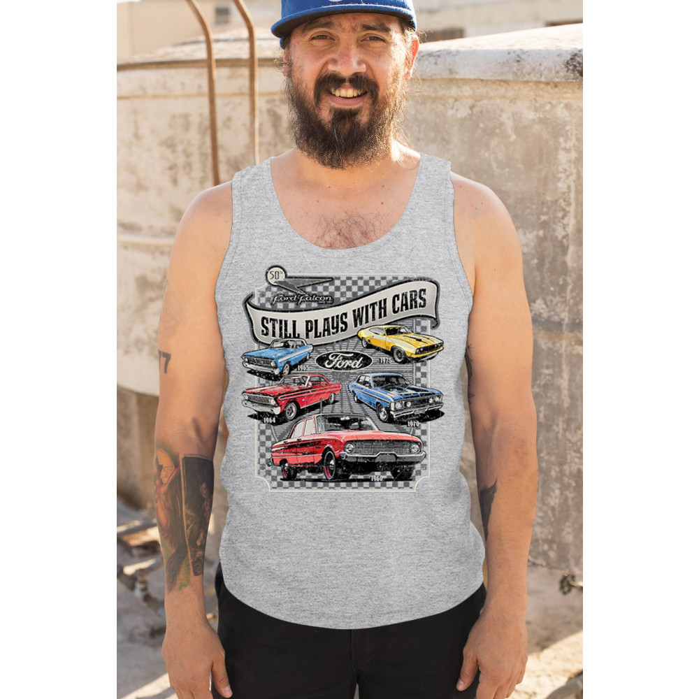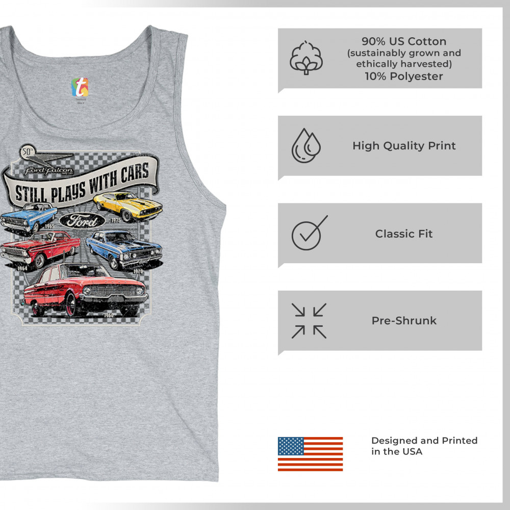 Still Plays With Cars pays tribute to the Ford Falcon, showcasing legendary models from the 60s and 70s for true vintage car lovers. Perfect for gearheads, hot rod fans, and classic car collectors, this design celebrates retro automobile culture, vintage horsepower, and old school rides. A great value piece for anyone devoted to the classic car scene.