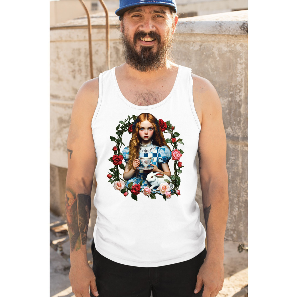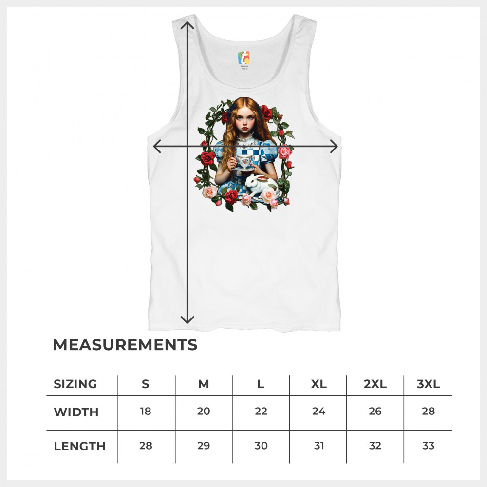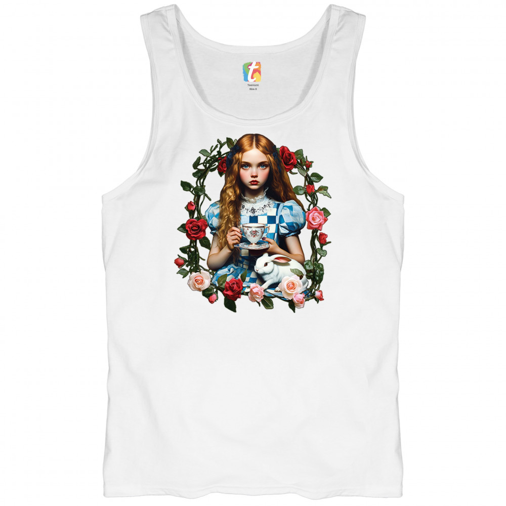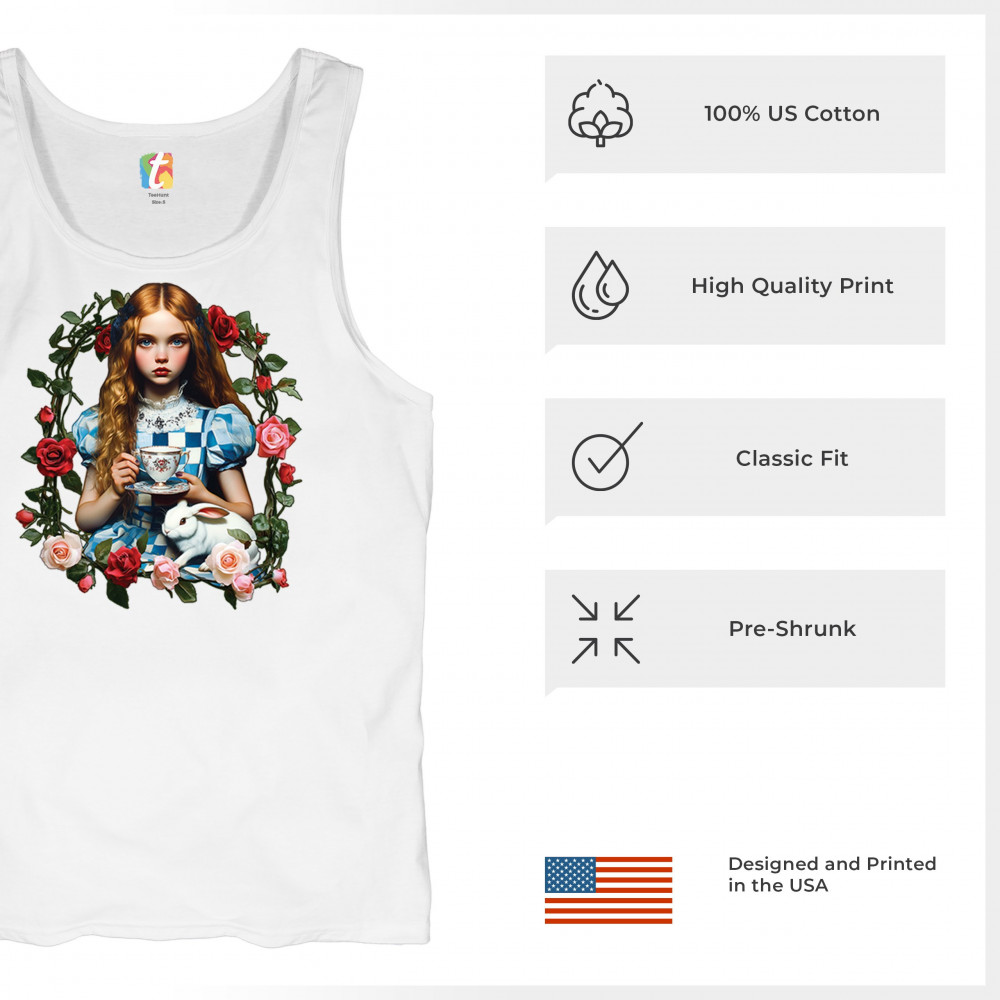 Step into a storybook dream with this Wonderland-inspired design featuring a young girl at a tea party with her white rabbit companion. Framed by roses, it evokes vintage charm, fantasy, and magical nostalgia. Ideal for bookworms, collectors, and lovers of fairytales, it blends whimsical elegance with timeless childhood wonder.