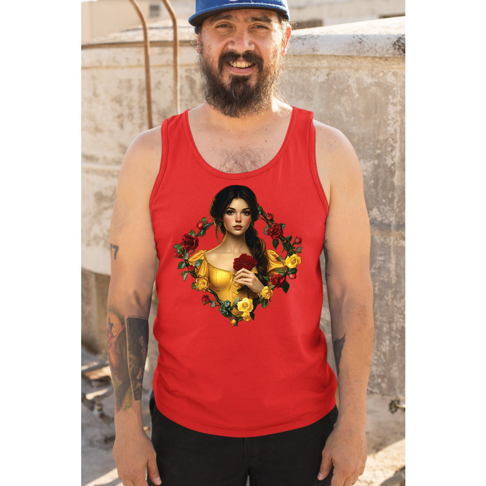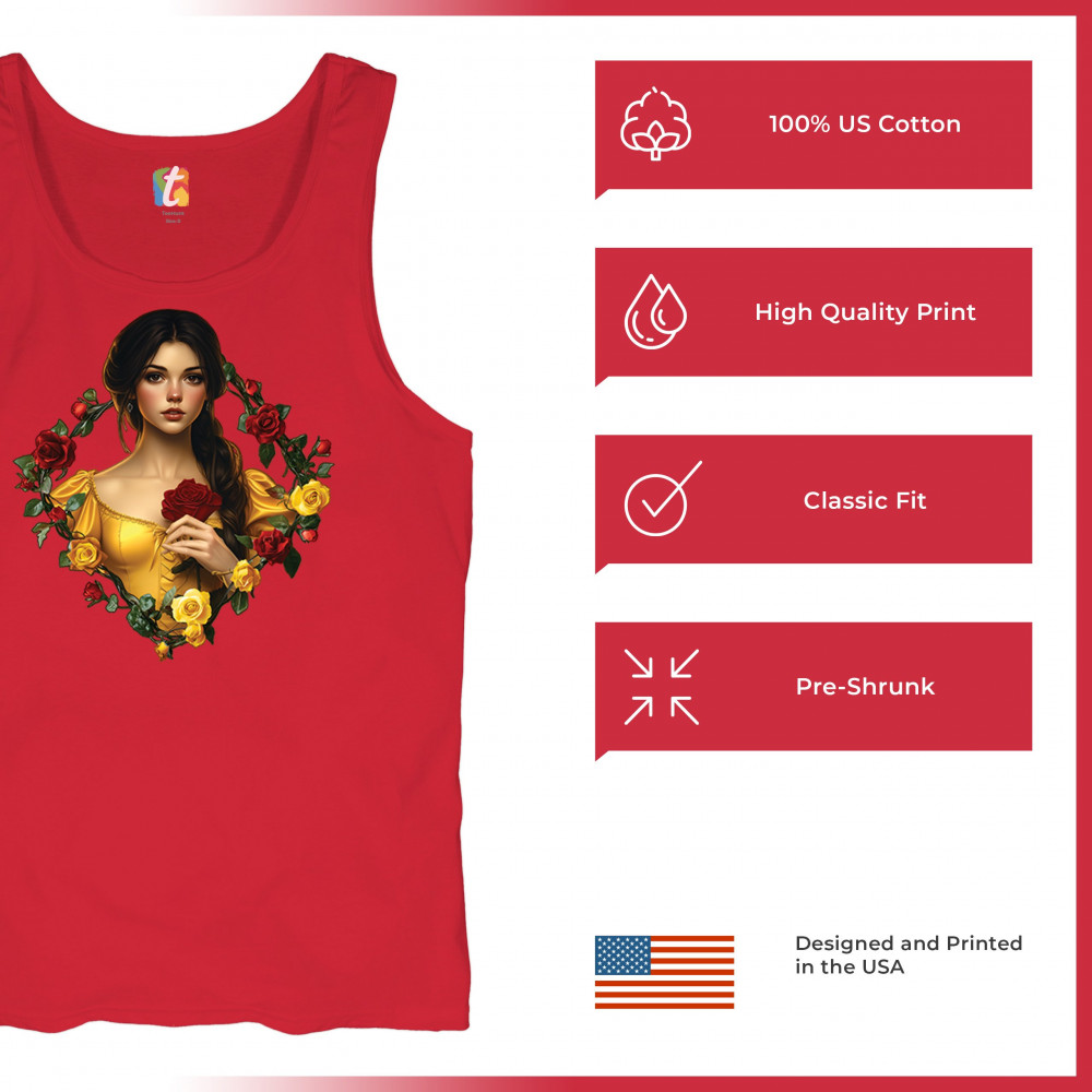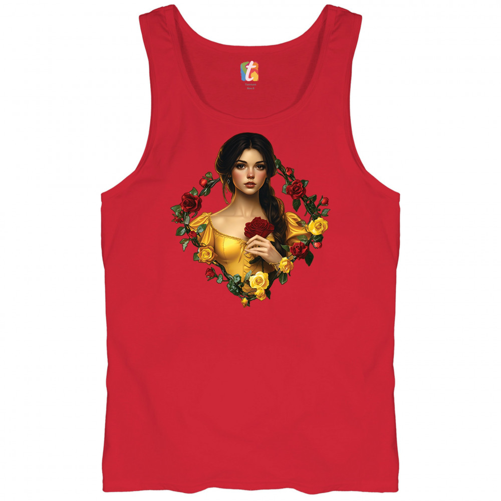Inspired by classic fairytales, this design features a girl in a yellow gown holding a red rose, framed by rich red and yellow roses. A tribute to Beauty and the Beast, it radiates warmth, romance, and timeless fantasy. Perfect for storybook lovers, enchanted art collectors, or those drawn to magical, symbolic imagery filled with beauty and grace.